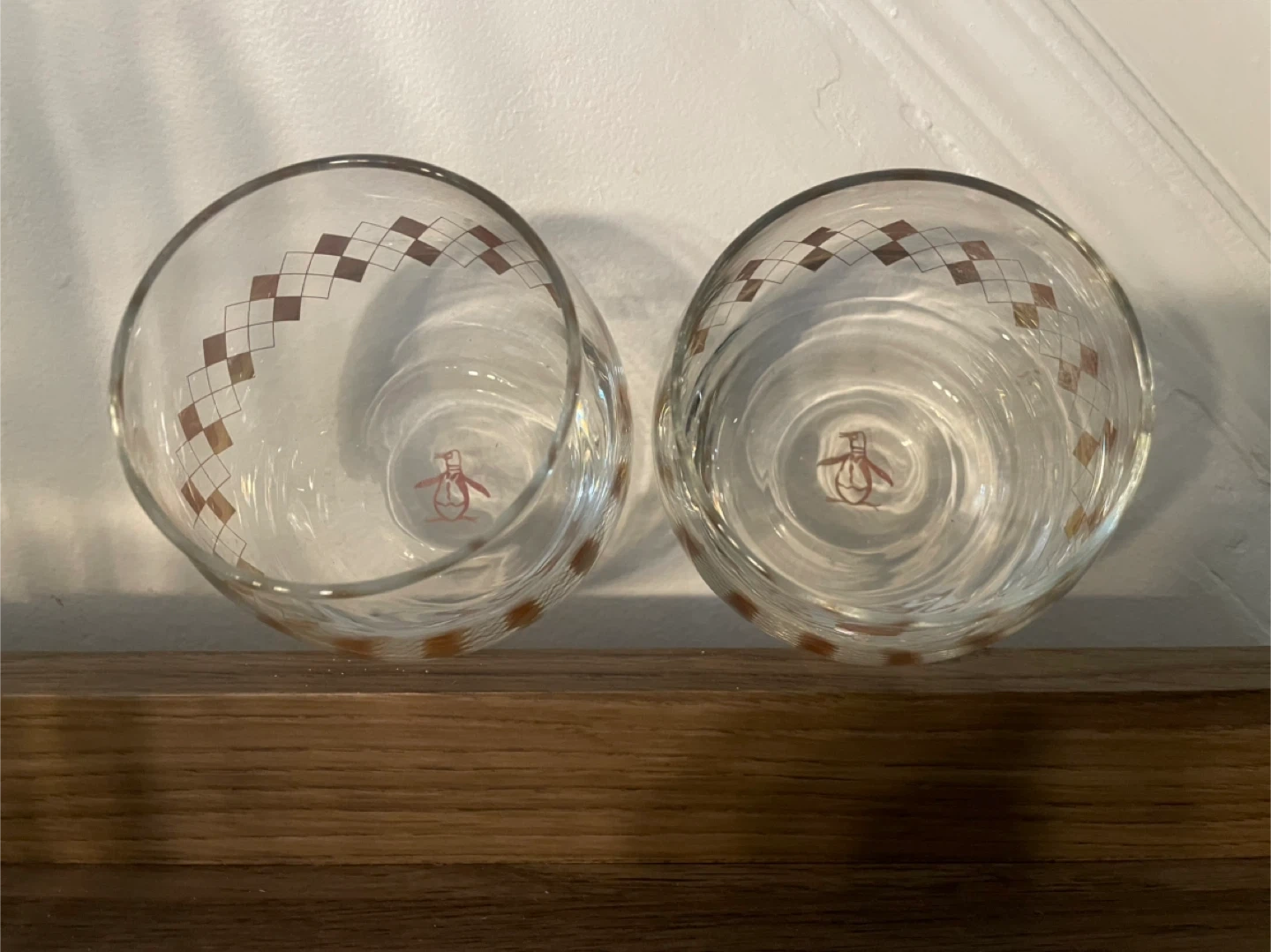 Selling a set of two Original Penguin glasses! They feature a fun diamond pattern and the iconic Penguin logo. Perfect for adding a touch of retro style to your glassware collection