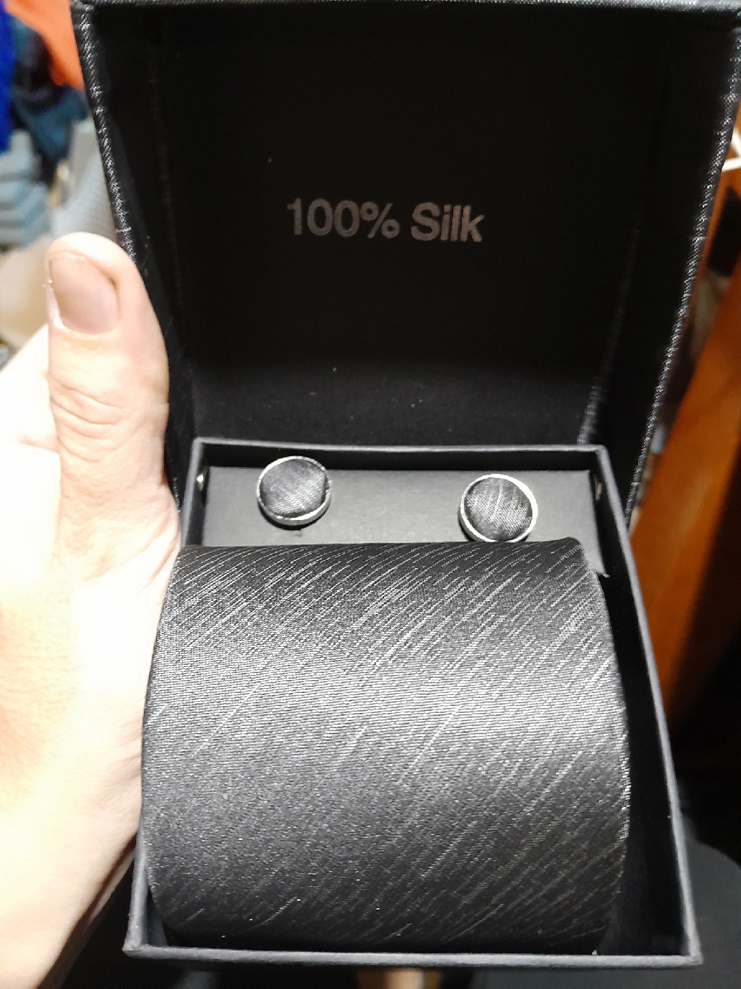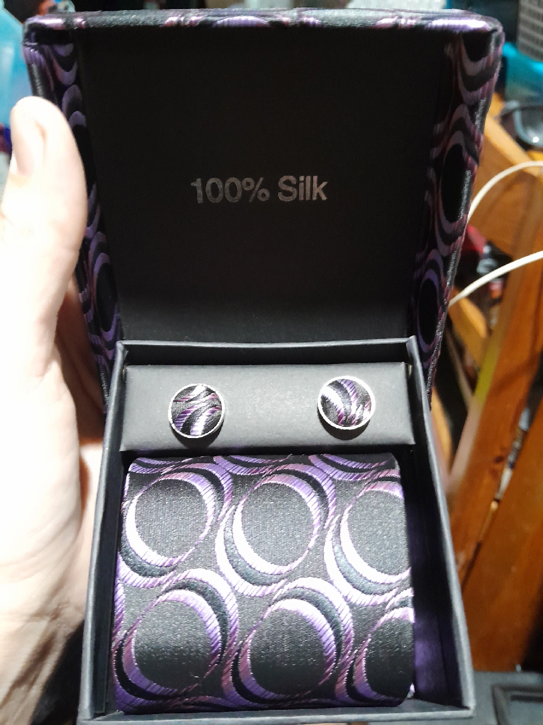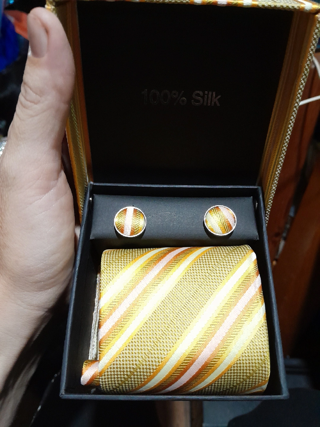 Selling a tie and cufflink set. The tie and cufflinks are made of 100% silk and come in a box. It's a great set! 5 each set