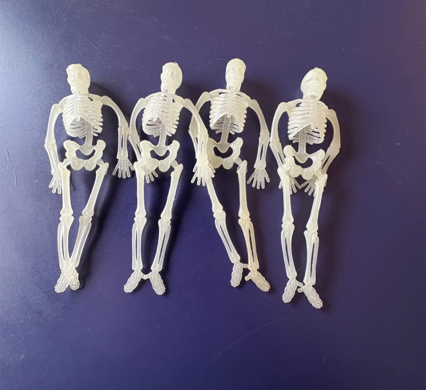 This includes a witch hat, a black cape and a set of four glow-in-the-dark skeleton decorations. Perfect for Halloween costumes or decorating. In like new condition.