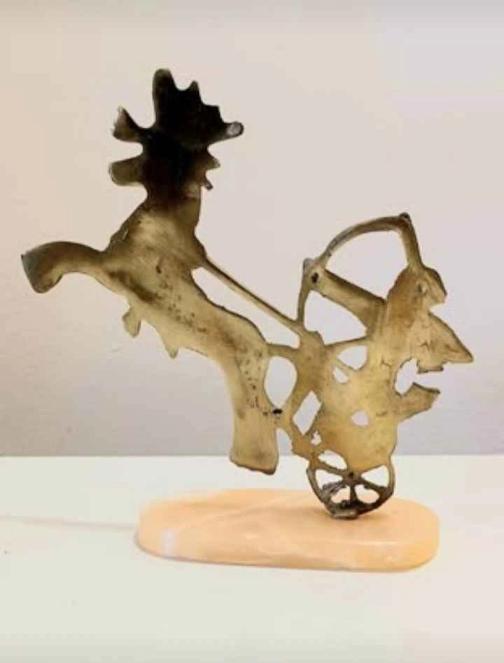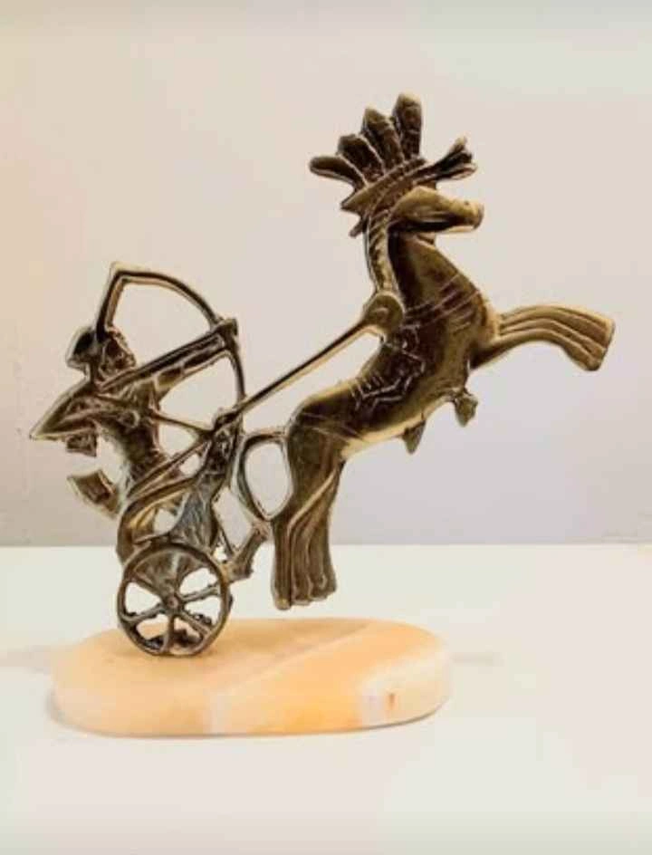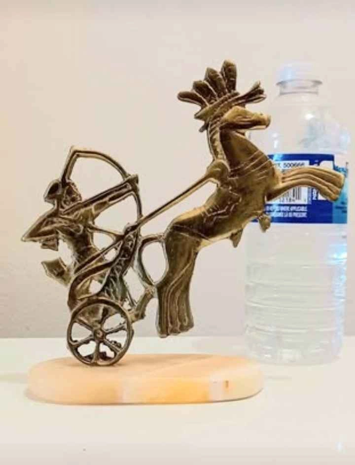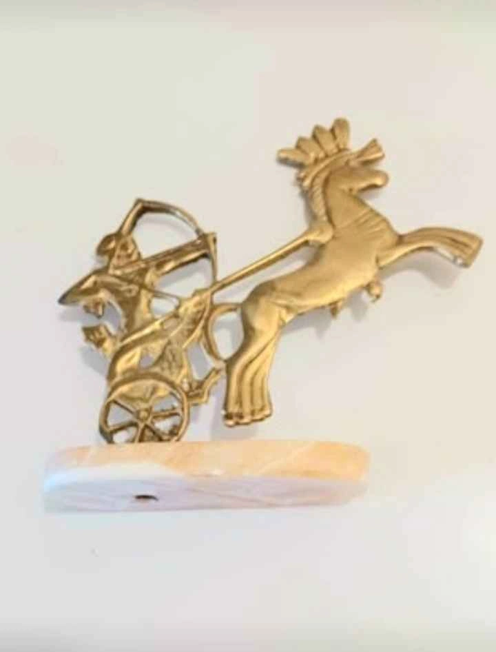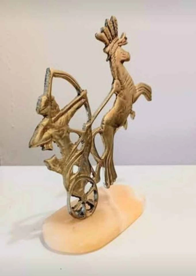 Pair of Vintage, Collectible, Brass Egyptian Pharaoh Chariot Horse Archer Statue, Mounted on a Marble Base. This Statue depicts a Pharaoh Riding in a Chariot pulled by Horse, with an Archer. The statue is approximately 6 inches tall. Please check out my other posts!