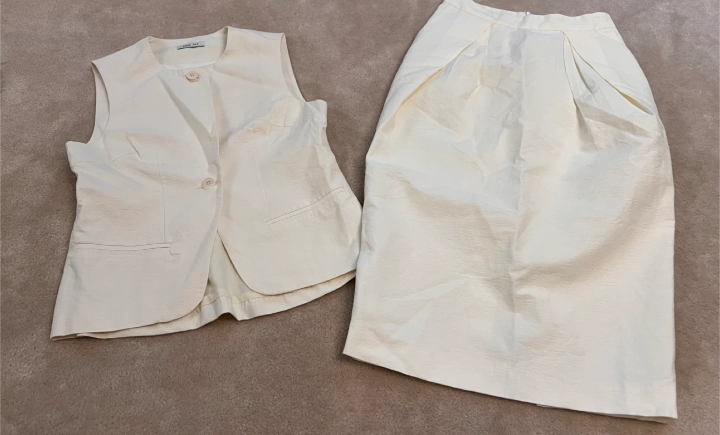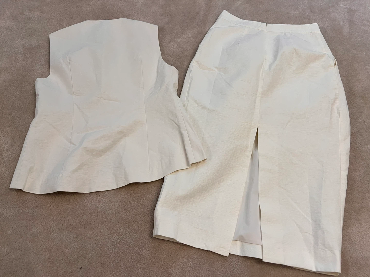 Selling a cream-coloured skirt suit set! The set includes a vest and a skirt, both in size medium. It's a stylish and versatile outfit that's perfect for various occasions. Great condition! Skirt has pockets!!