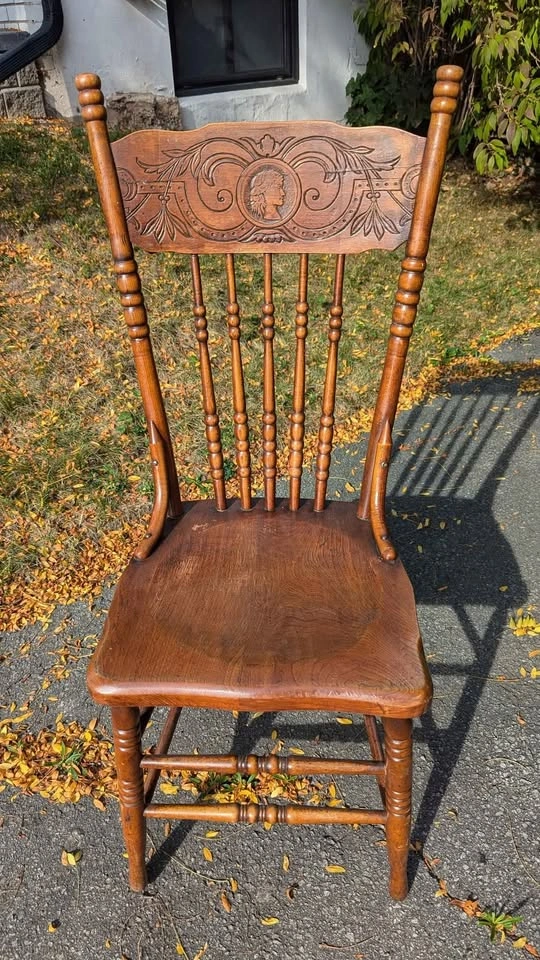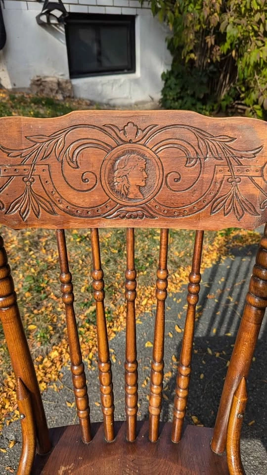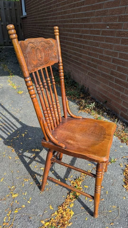 *SET OF 4 FOR $75 Total , FOR FAST PICKUP!* Beautiful carved chair! In good condition especially for age, some wear is to be expected but adds to character , structure is solid & sturdy . 15x16x40.5 oak wood dining chair with carved detail on back. I have a set of 4 of these available! $75 for the entire set otherwise $25 individually.