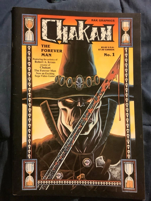 Chakan the Forever Man issue one second printing. The cover is signed in gold and there’s a dedication and sketch on the title page by writer/artist Robert A Kraus. Includes black and white prints. Was later a fun Sega Genesis game. Clean book with no folds or rips. Curb side pickup. Buy multiple items for a discount.