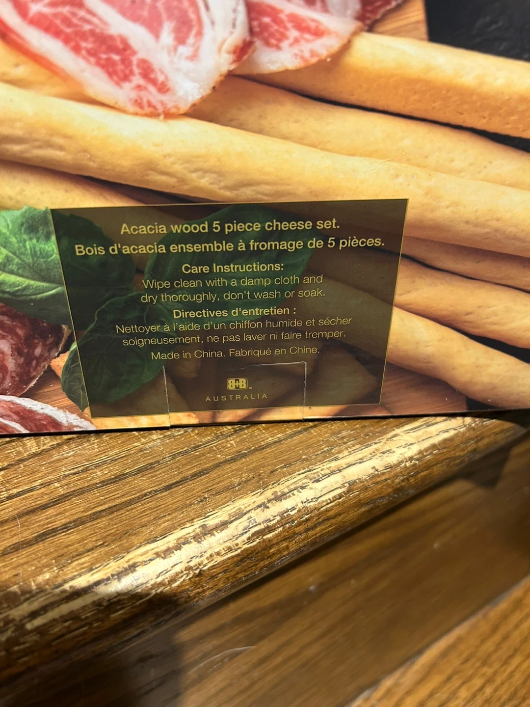 Selling a brand new Cibo acacia wood 5-piece cheese set! This set is perfect for entertaining and serving your favourite cheeses. The care instructions are simple: just wipe clean with a damp cloth and dry thoroughly. Don't wash or soak. Made in China