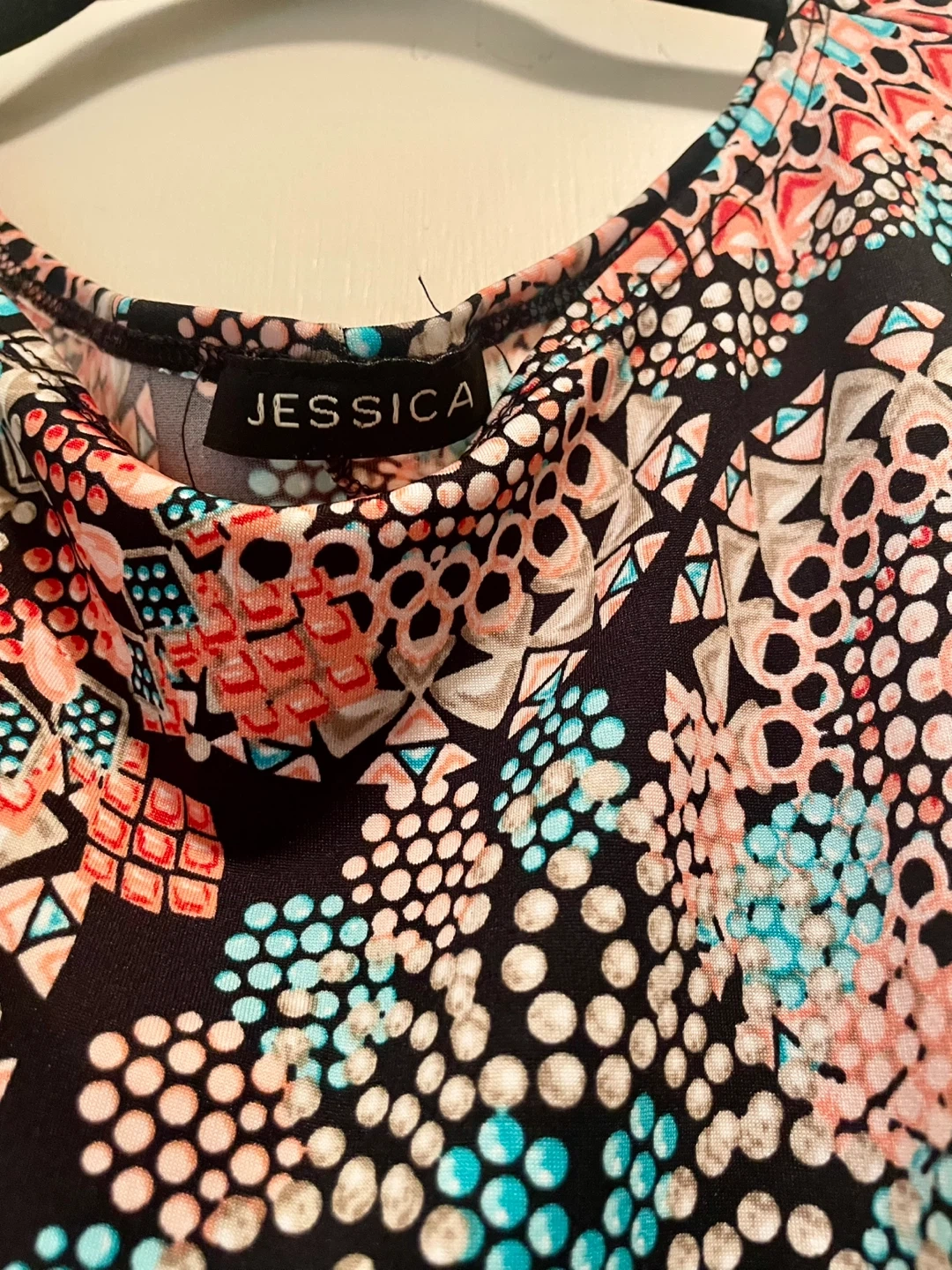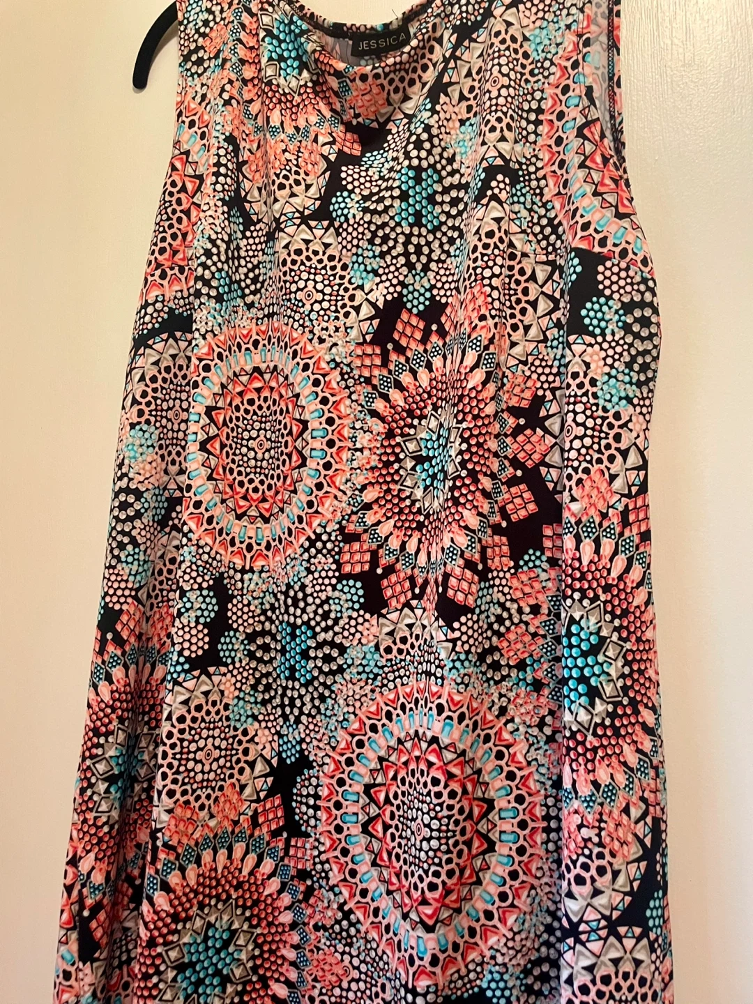 Selling a Jessica sleeveless dress with a colourful pattern. It's in great condition and ready for a new home! The dress features a unique design with a mix of colours.