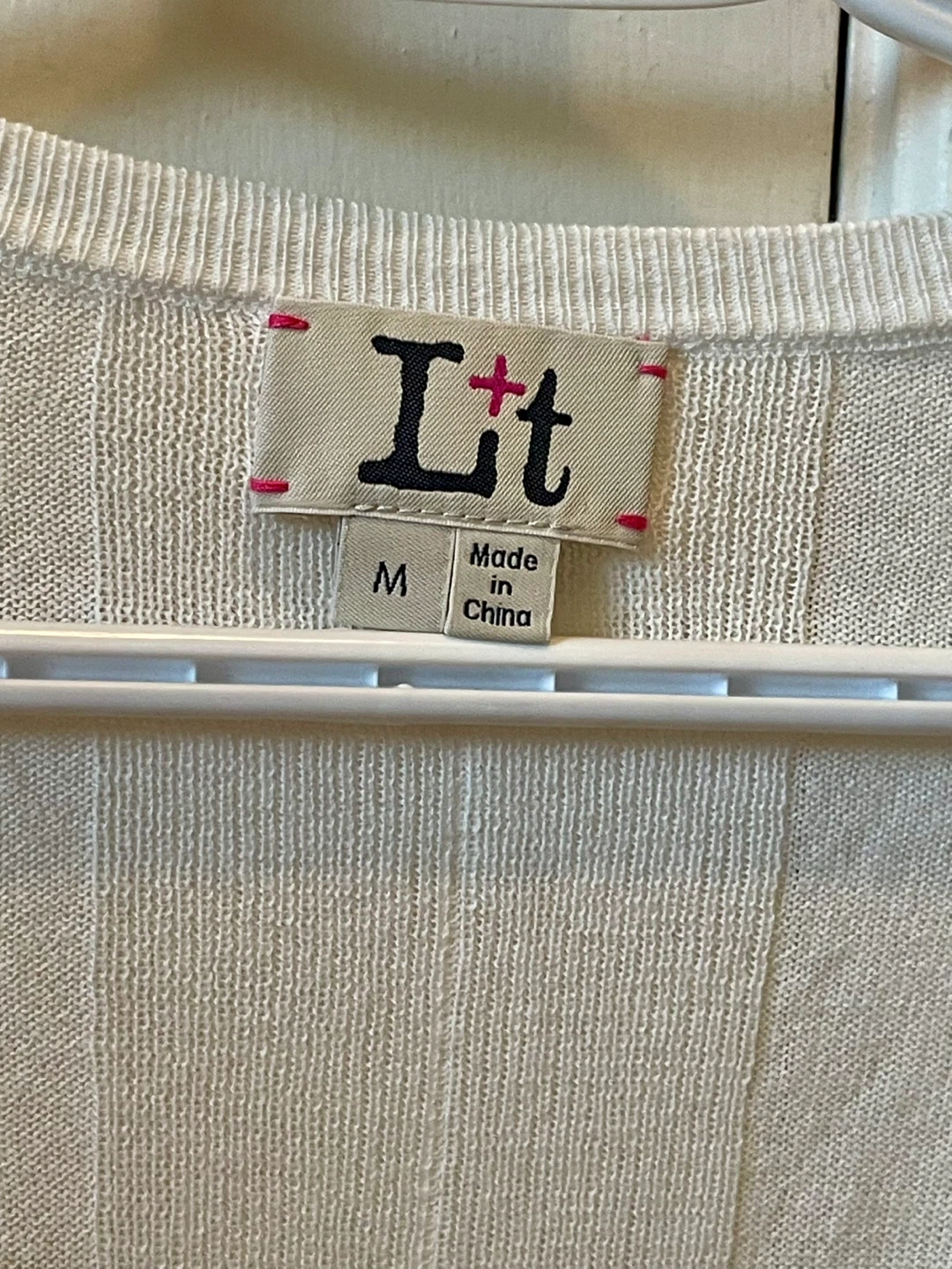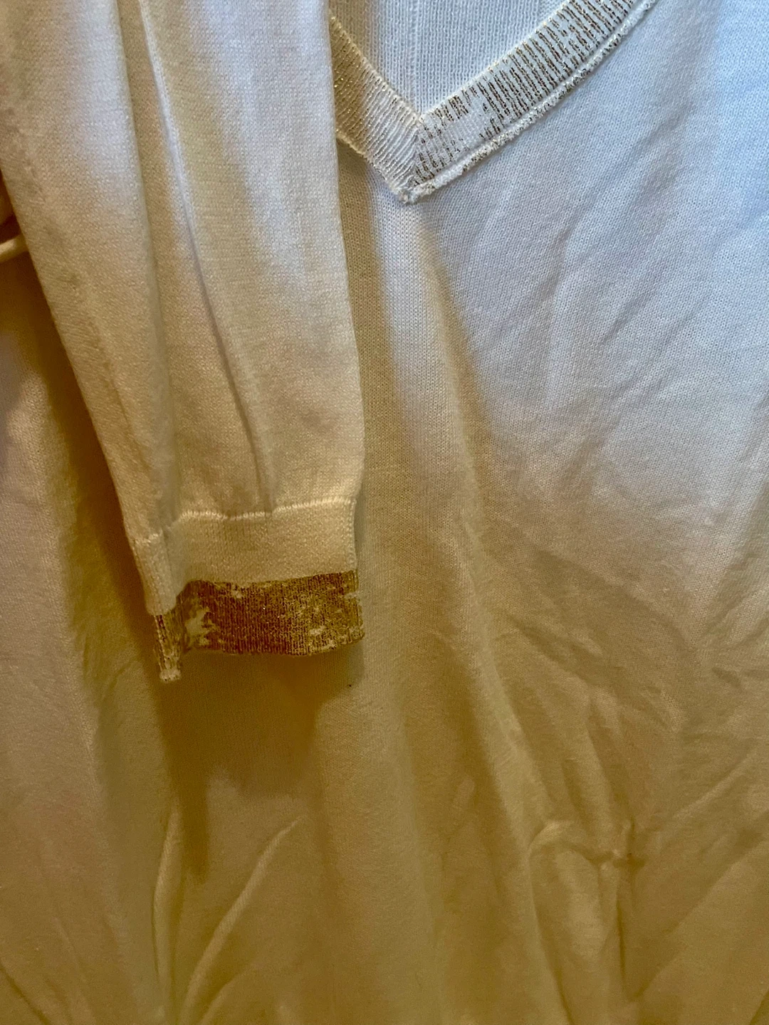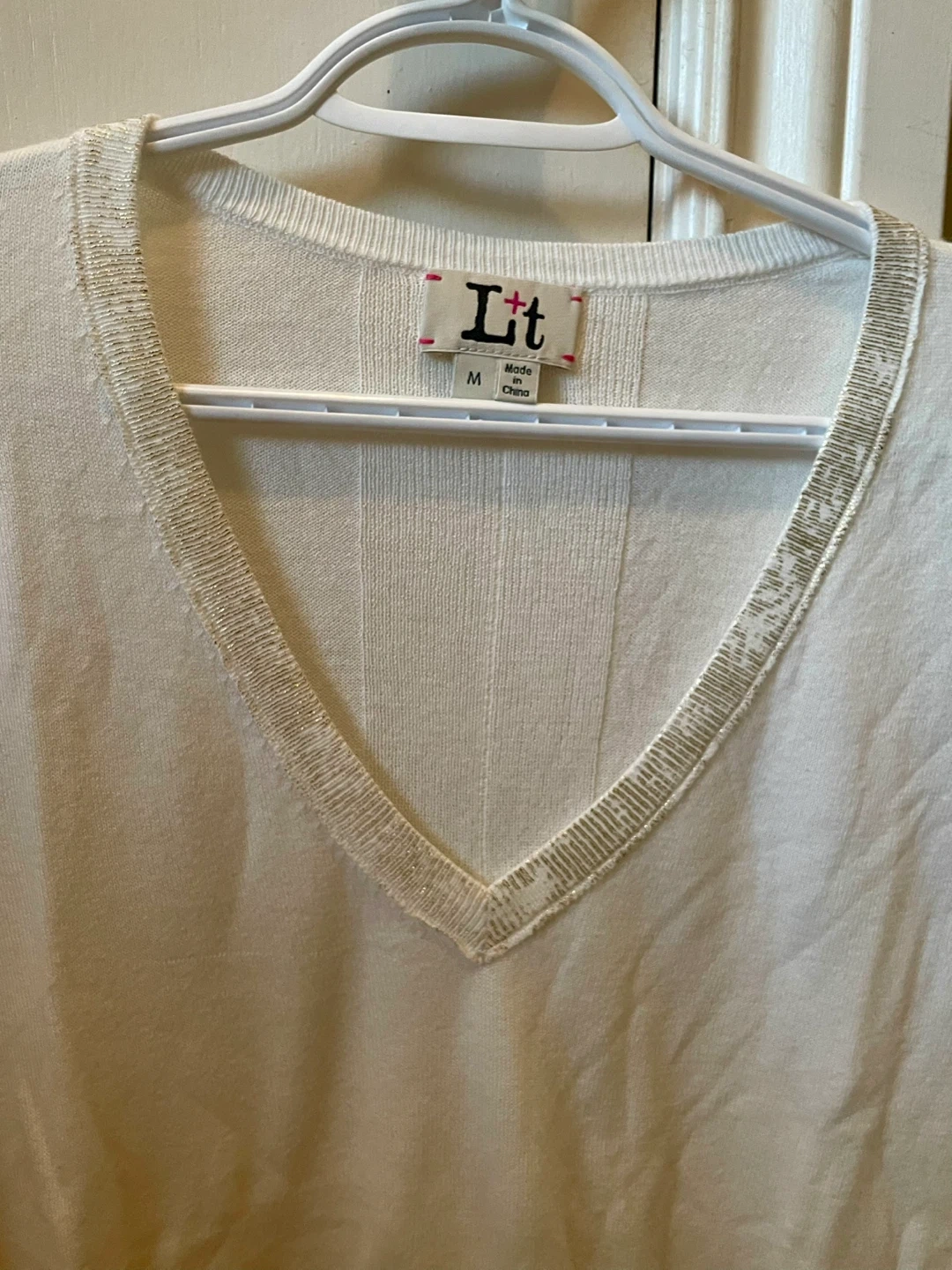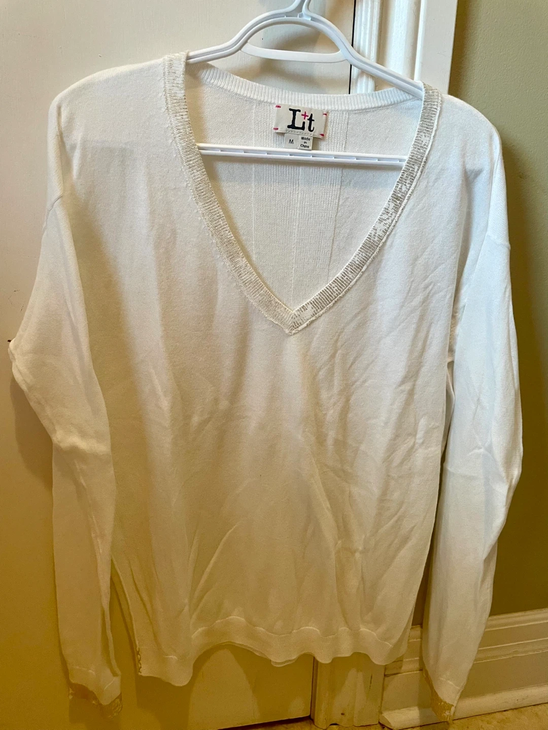 Cozy Lt white sweater with a stylish V-neck! It has a subtle shimmer detail around the neckline and cuffs. Size is M.