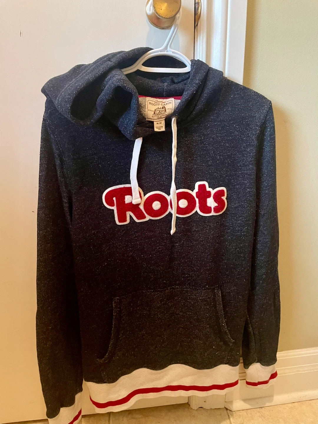 Cozy Roots Cabin hoodie in size M/M! It features the classic Roots logo on the front and a comfortable fit. Perfect for staying warm on chilly days!
