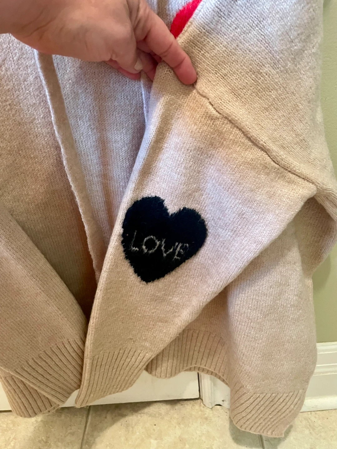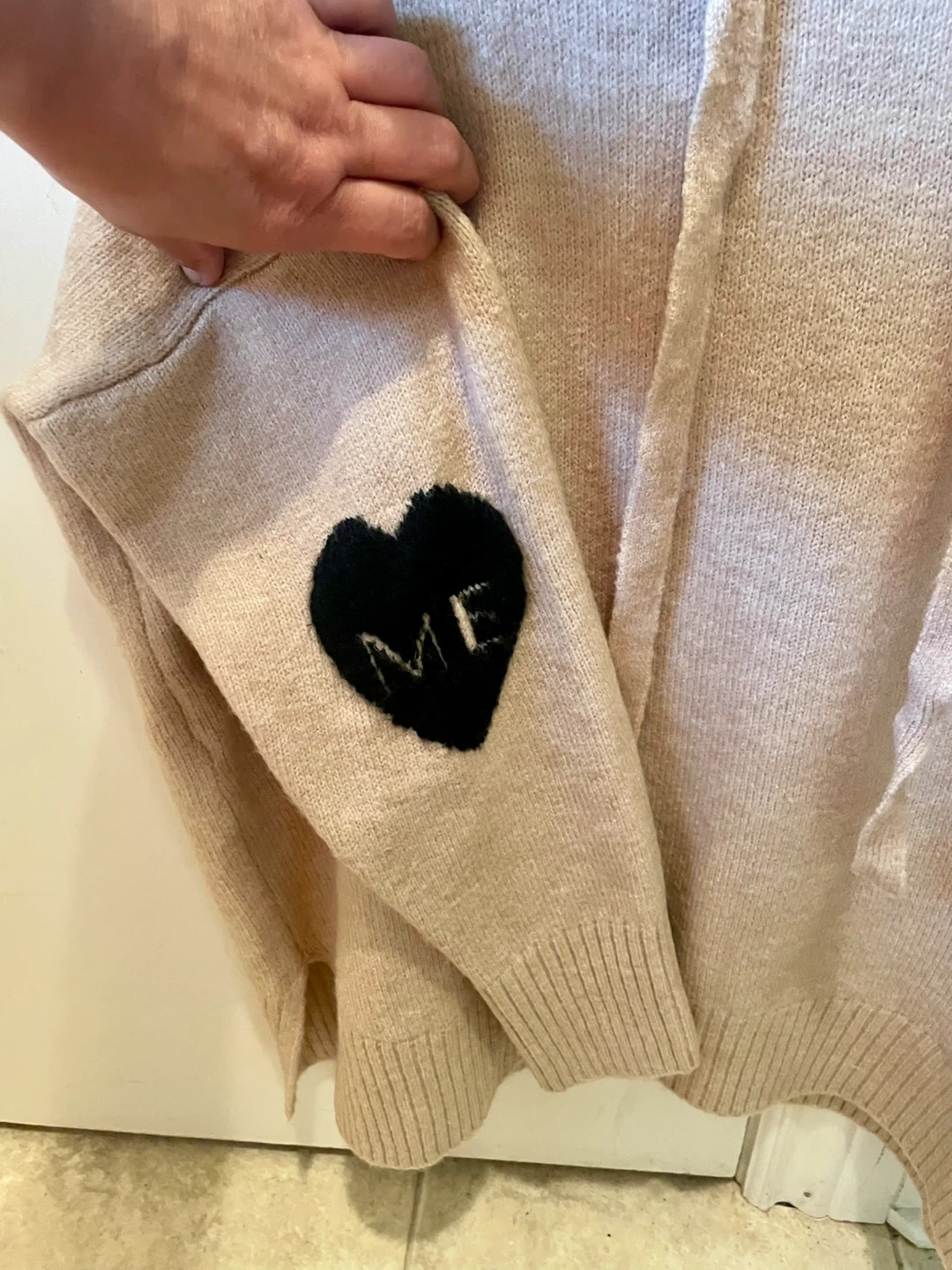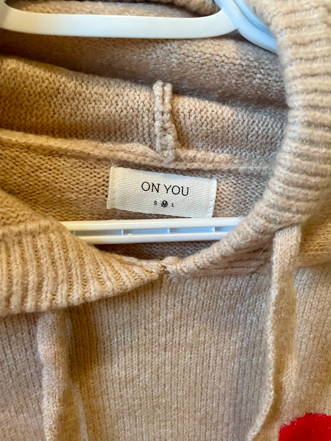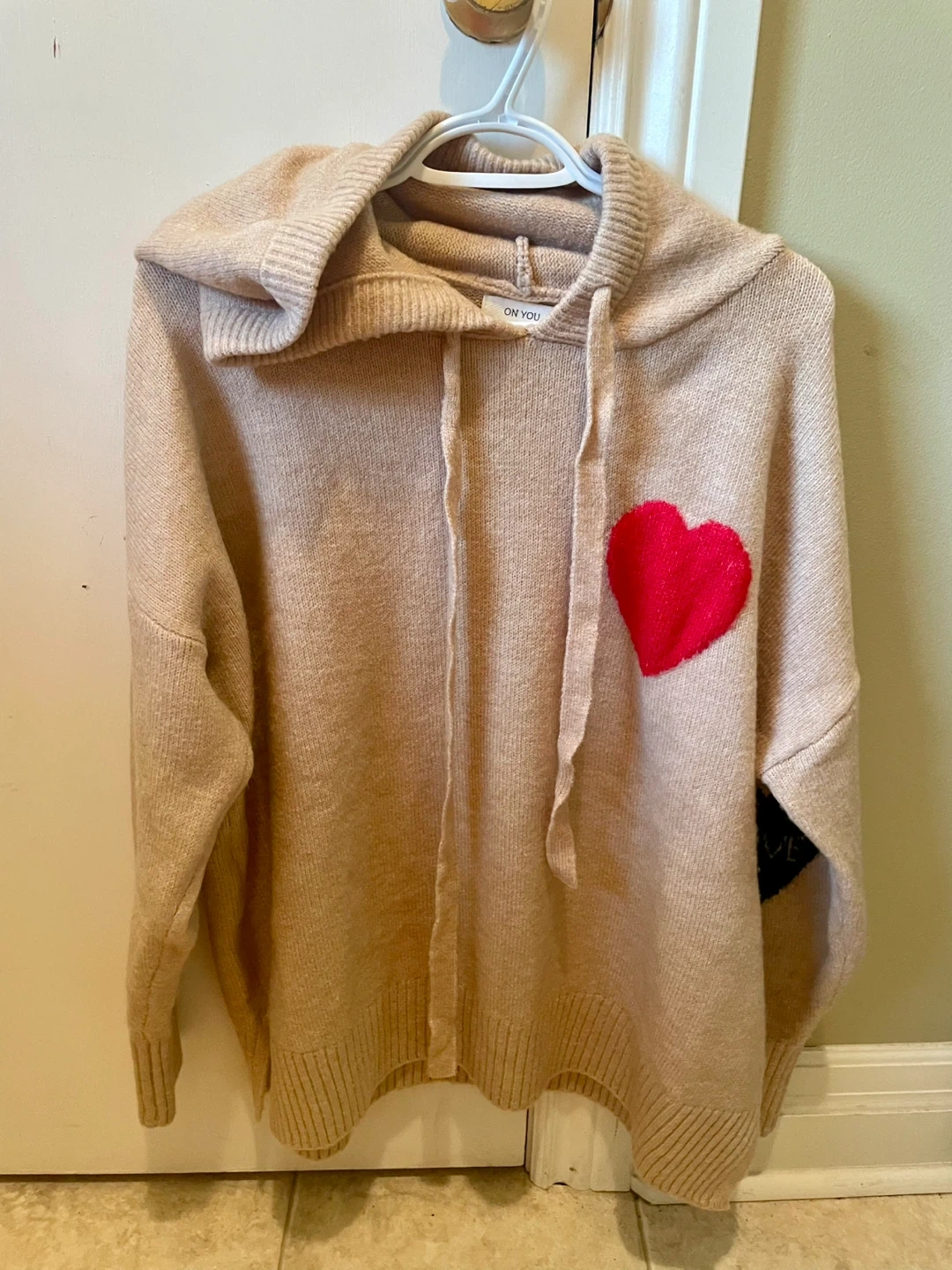 Cozy On You hoodie with a cute heart design! It's a size medium and in great condition. Features a beige colour with a red heart on the front and black hearts with 'ME' and 'LOVE' on the sleeves. Perfect for adding a touch of love to your wardrobe!