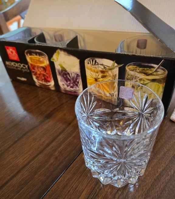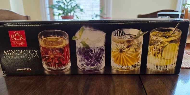 Set of 4 Crystal, etched glasses Approx 10 oz each Made in Italy New in box, never used