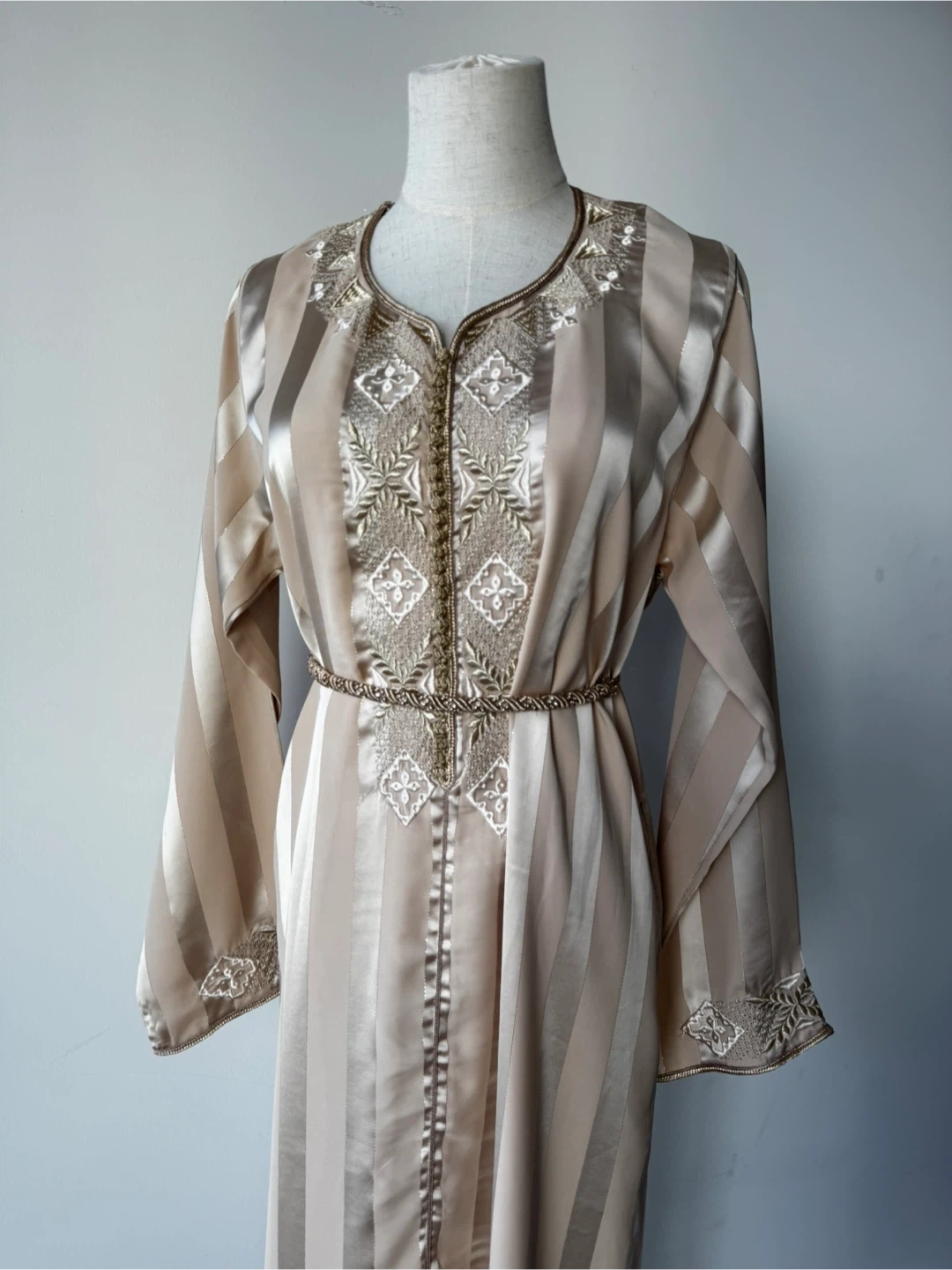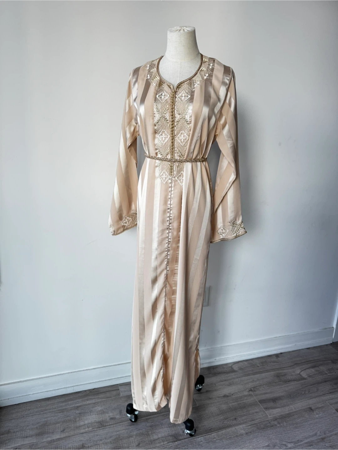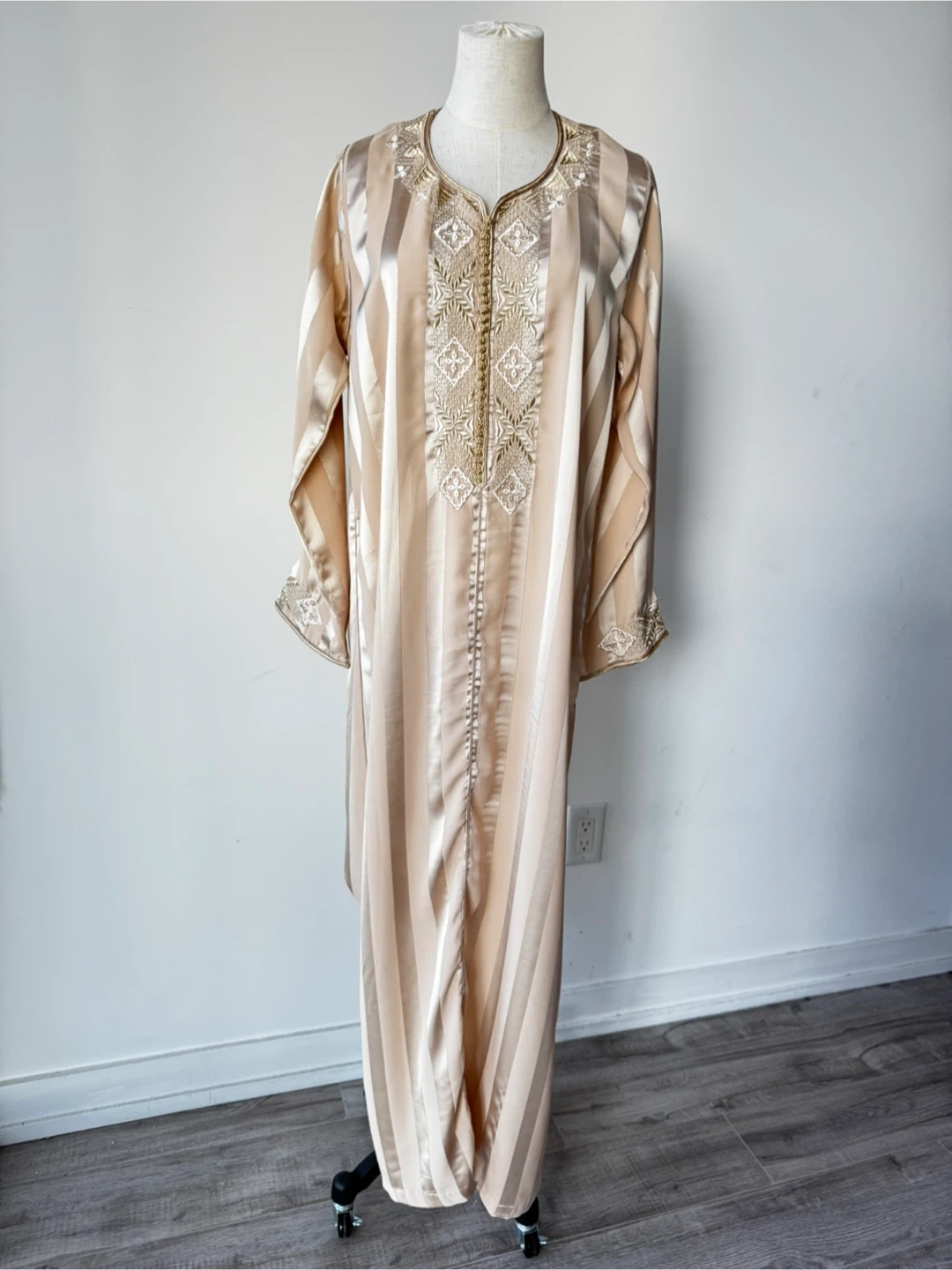 This is a beautiful, long-sleeved caftan dress in a striped beige colour. It features intricate embroidery details. Perfect for special occasions!