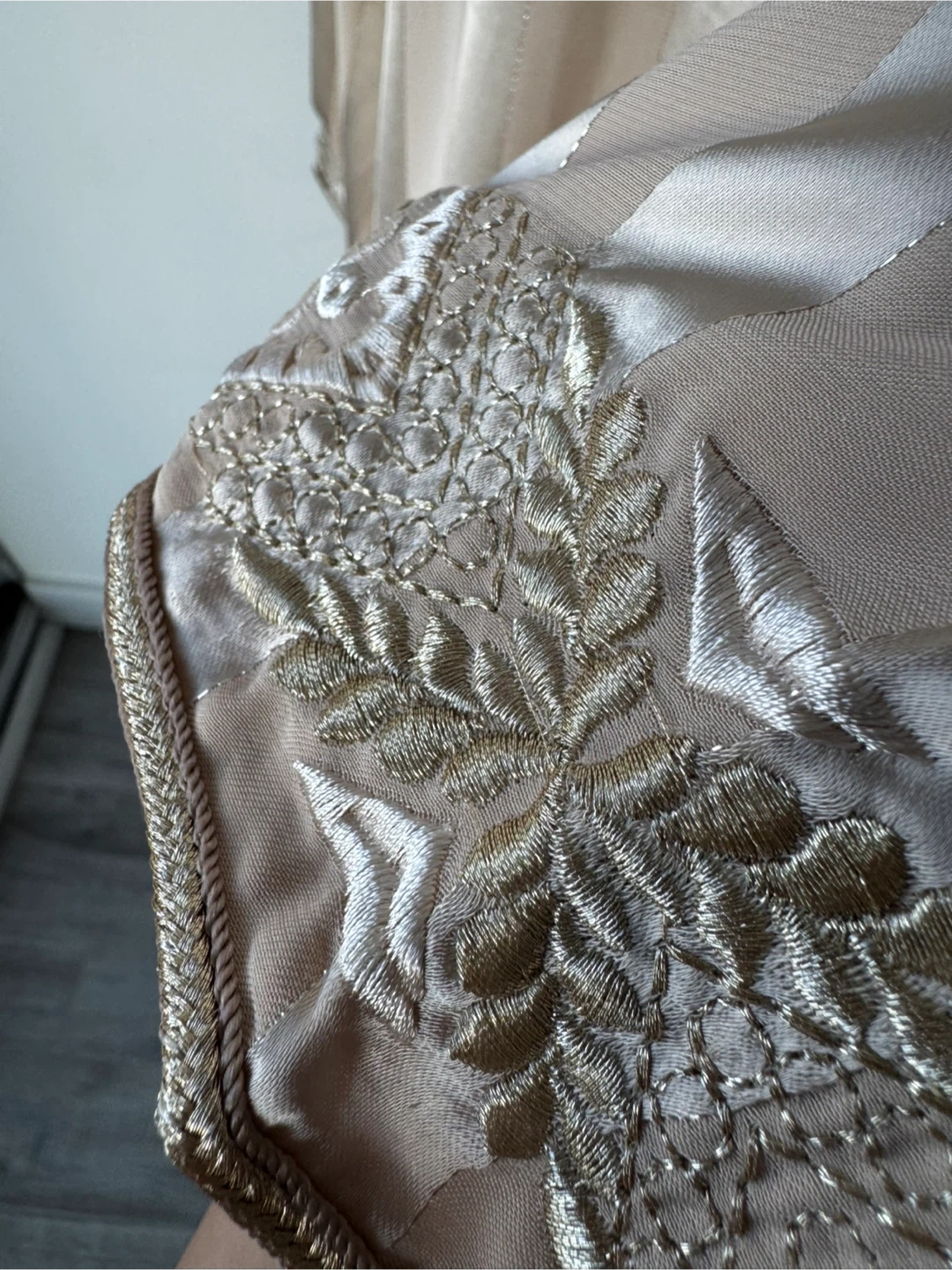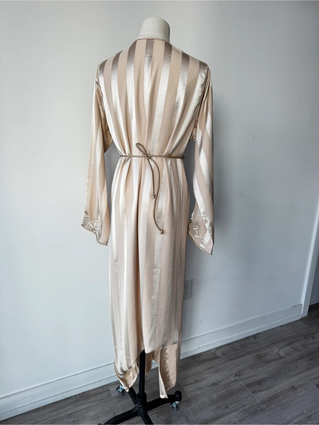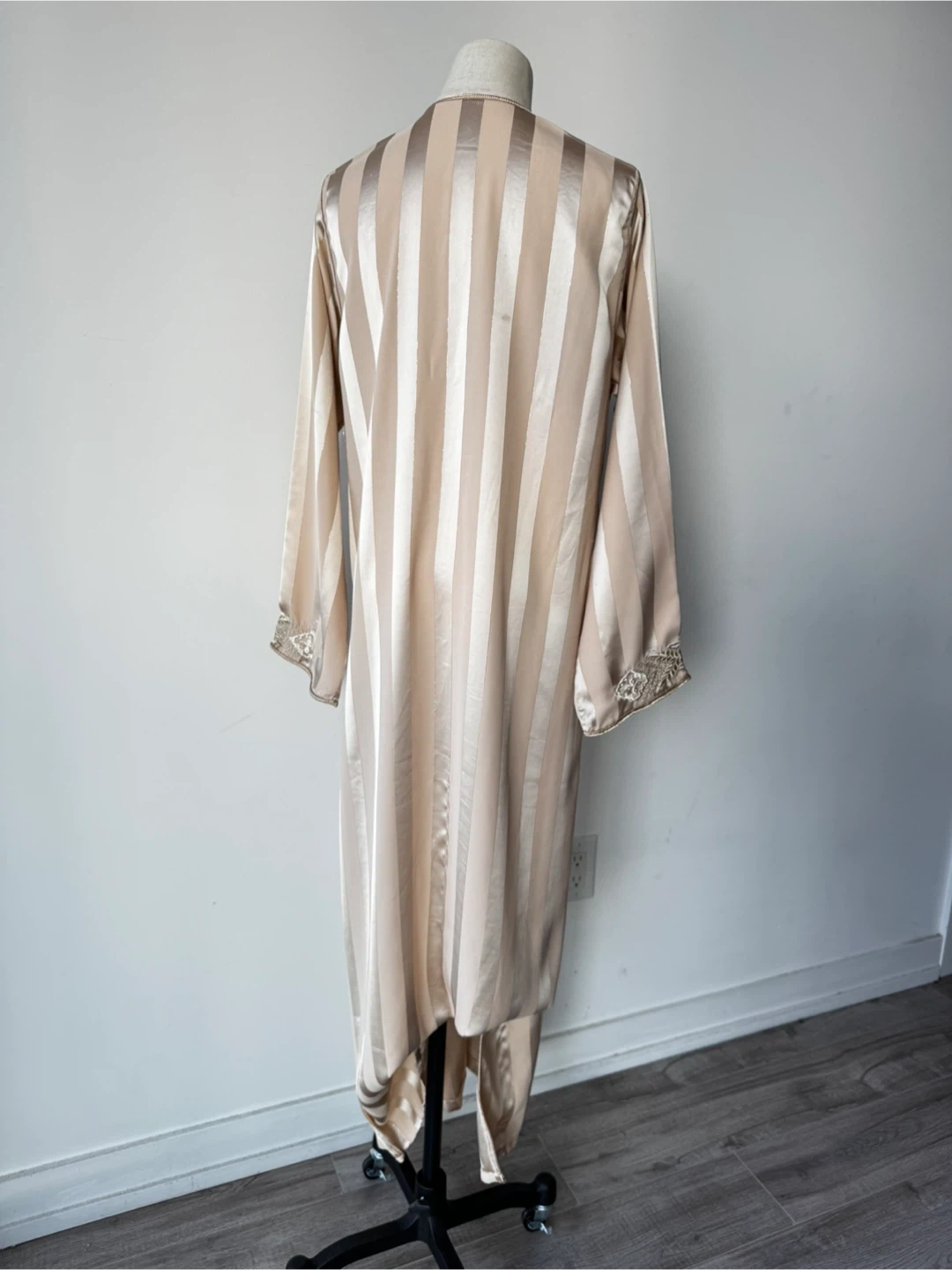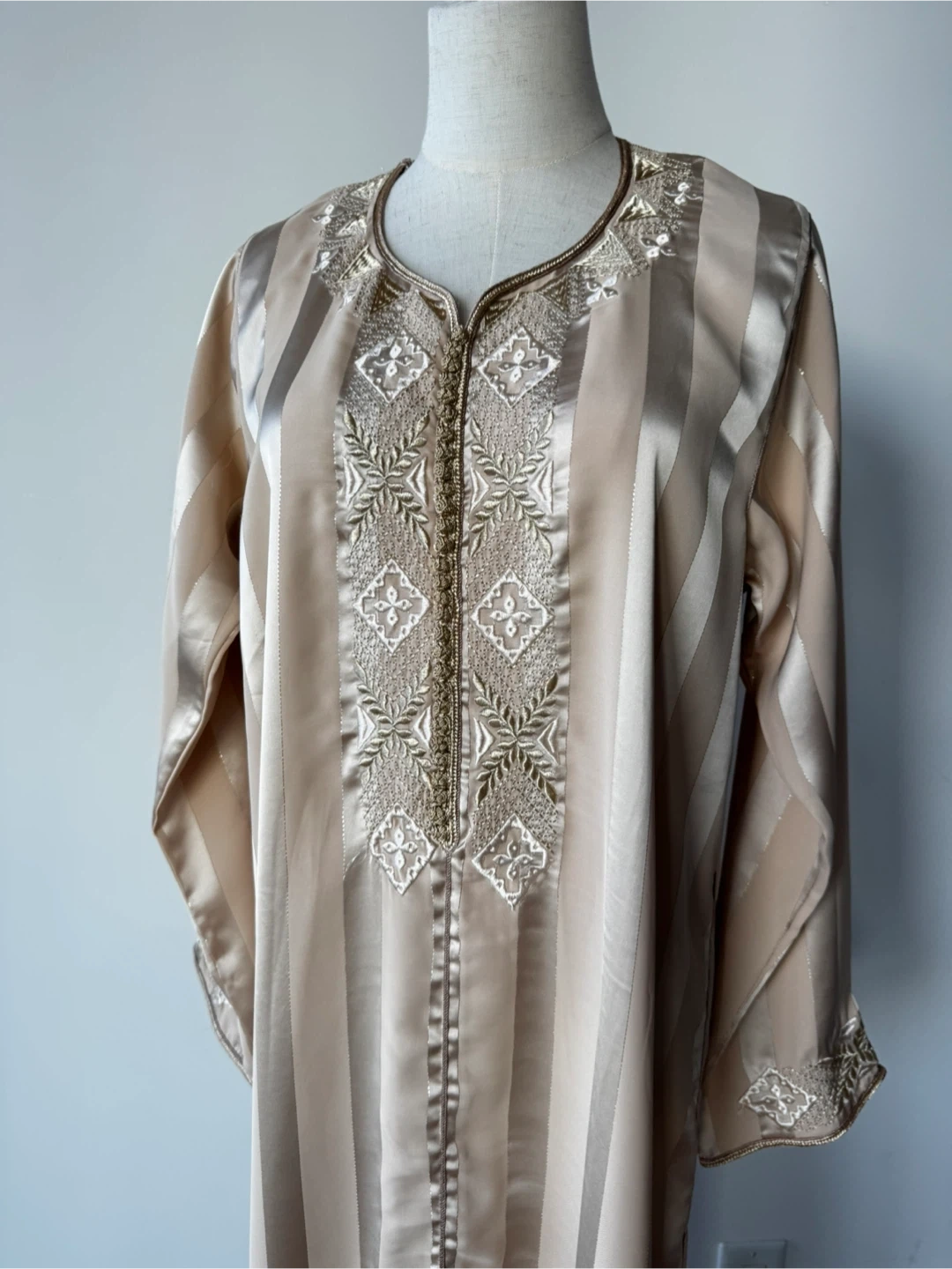 This is a beautiful, long-sleeved caftan dress in a striped beige colour. It features intricate embroidery details. Perfect for special occasions!
