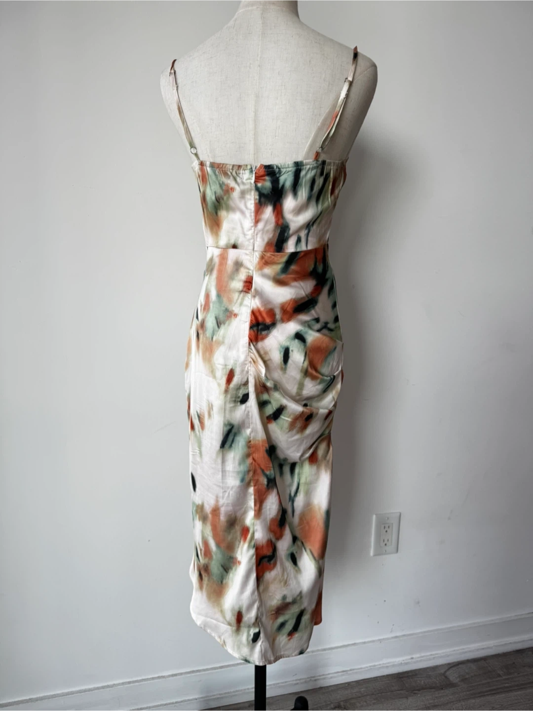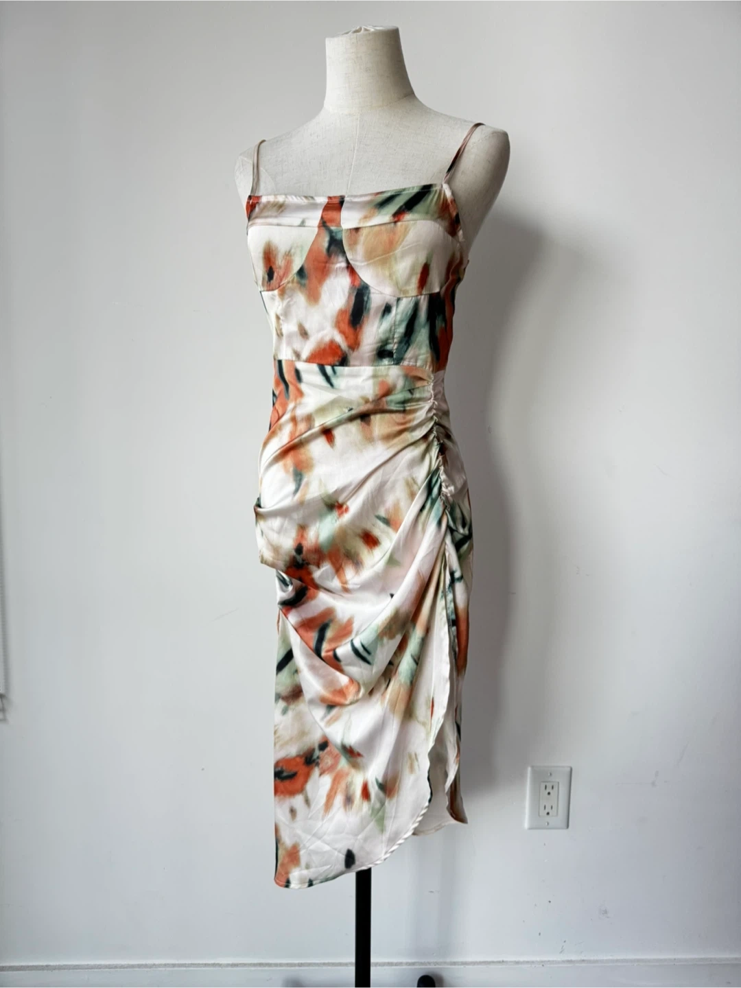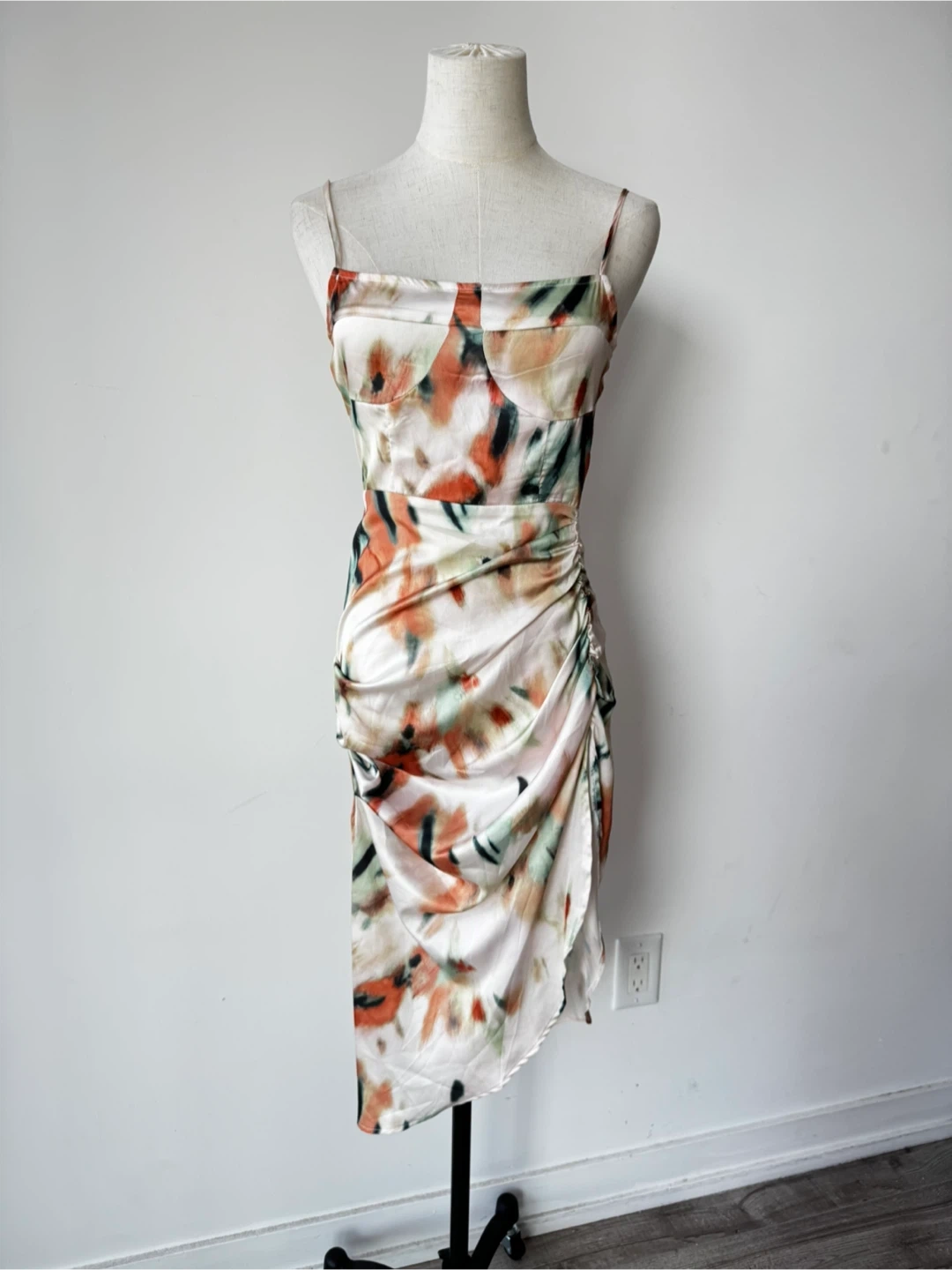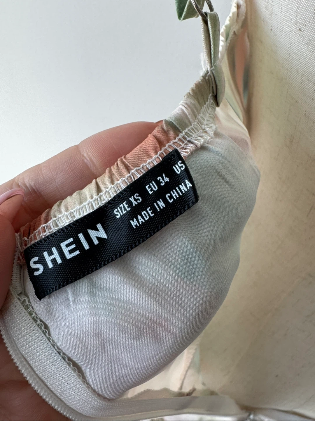 This is a Shein cami dress in size XS. It features a floral print and ruched detailing, giving it a bodycon fit. The dress is made in China and has adjustable straps