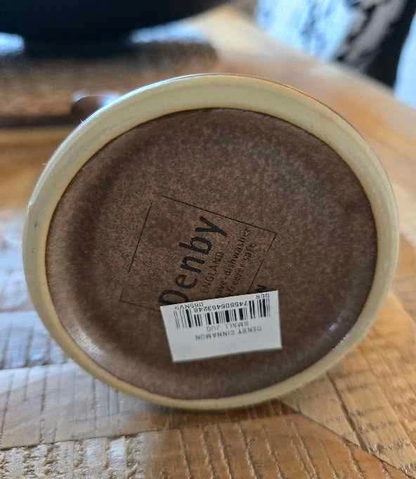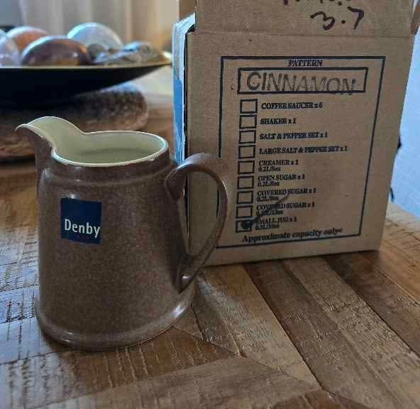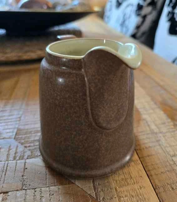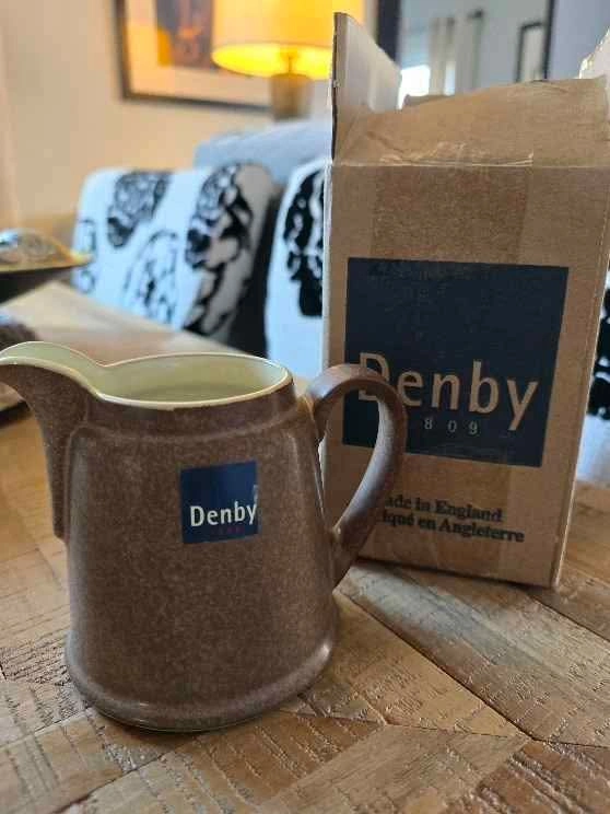 Small creamer jug. Can be used for sauces, gravies or even to hold flowers. Size: 10 oz Colour: Taupe with stone brown edging Brand: Denby Pottery, made in England AUTHENTIC New in box, never used Check out my other matching stoneware, including sugar bowl with lid. Less expensive than buying directly from Denby + no taxes or shipping costs! Cash sale please. Pick up only in North Oshawa