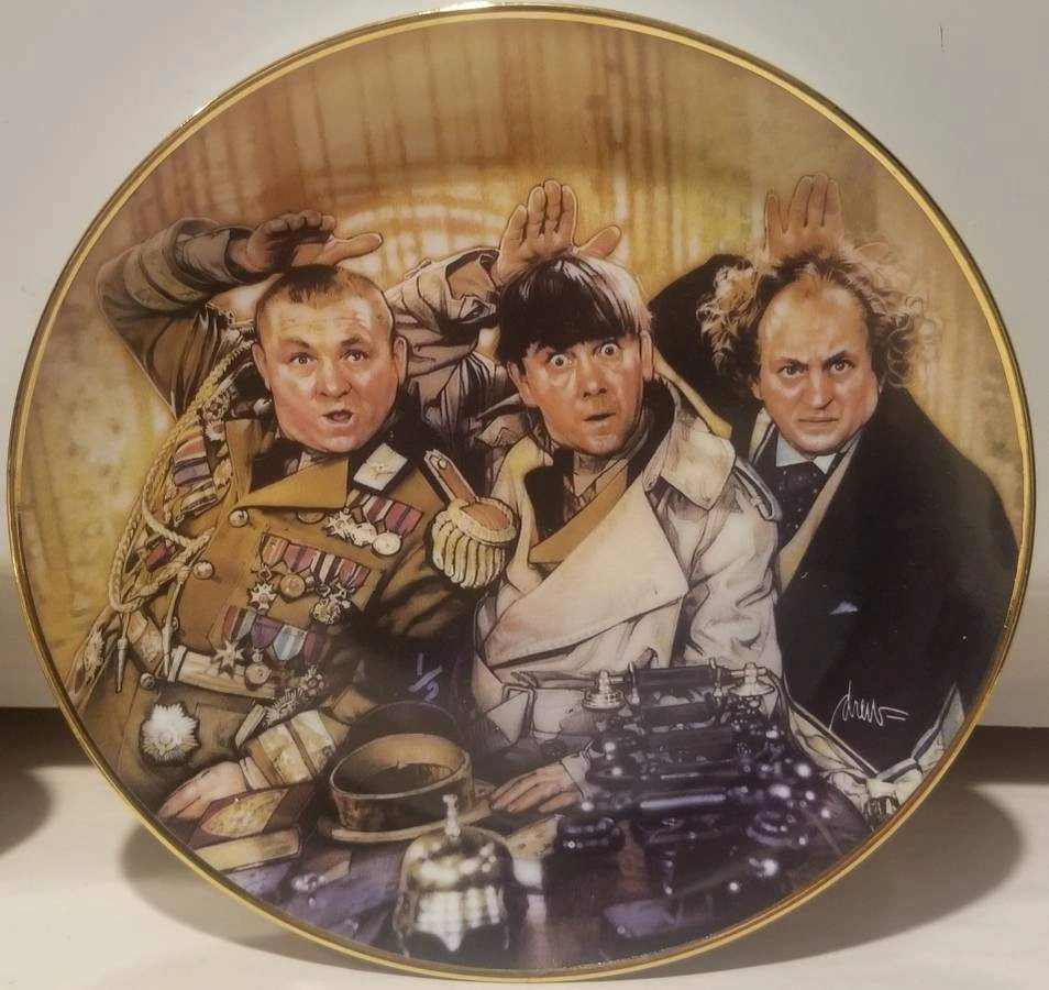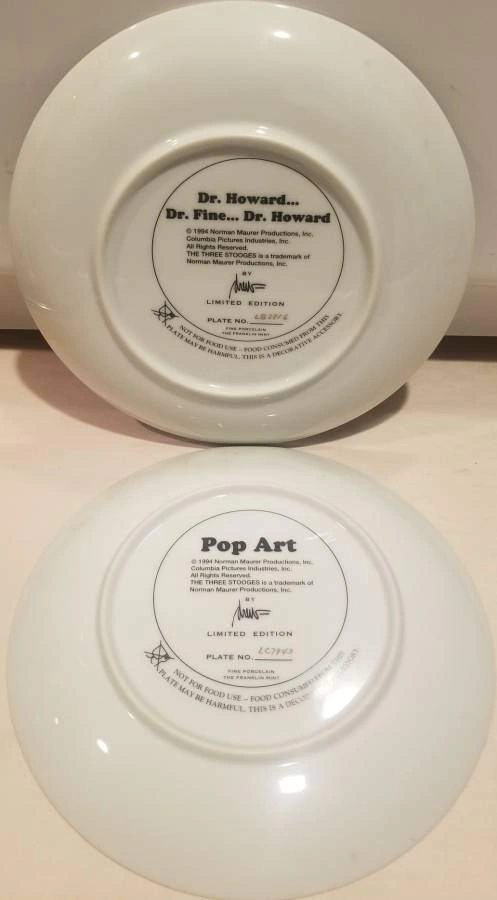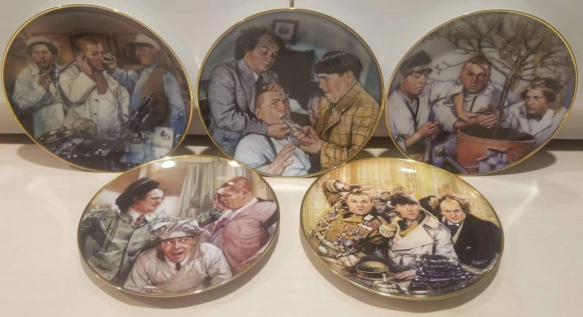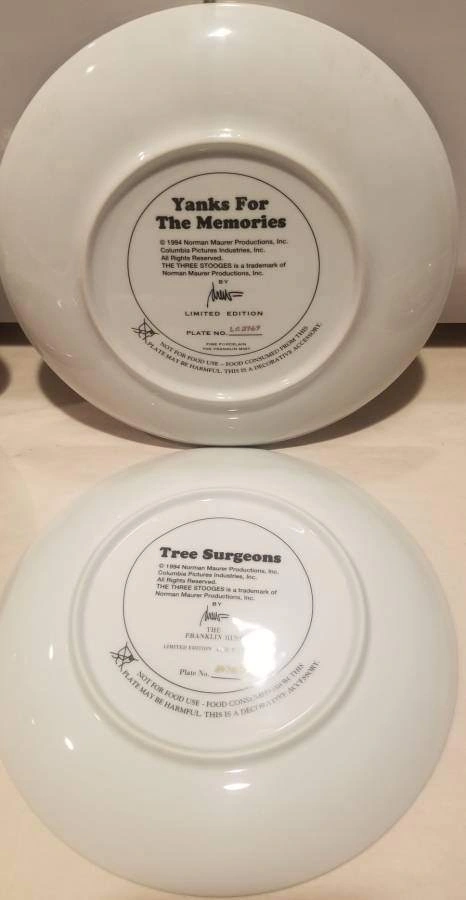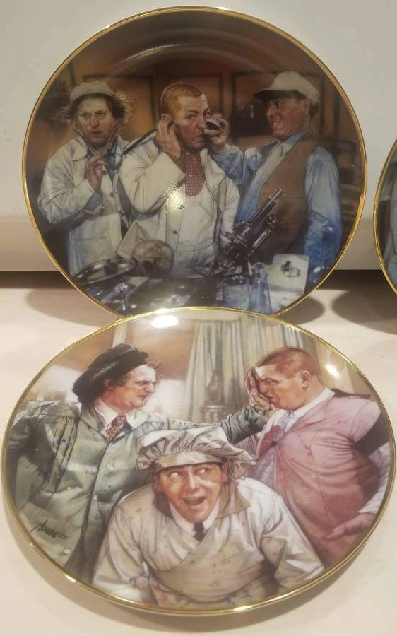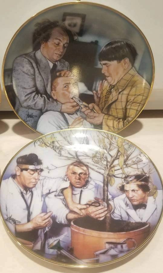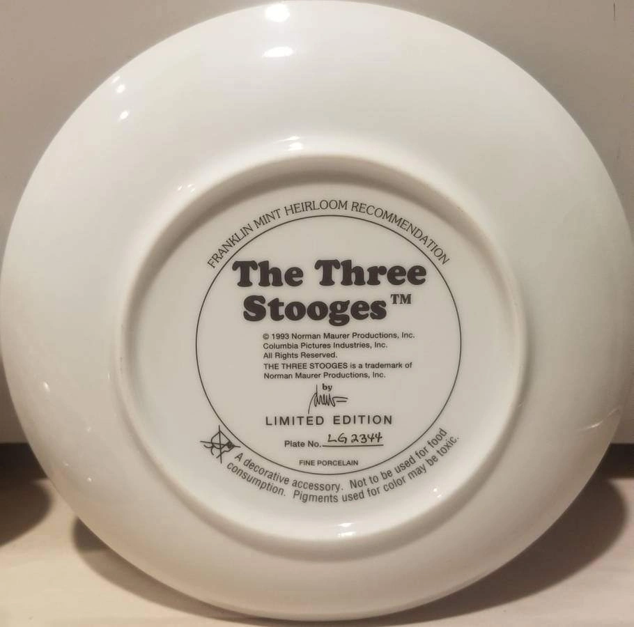 Franklin Mint Three Stooges Collector Plates – Set of 5 E-Transfers Accepted Pick Up Anytime Set of 5 limited edition Franklin Mint porcelain collector plates featuring the legendary Three Stooges. Produced in 1993–1994 under license from Columbia Pictures / Norman Maurer Productions. Plates included: The Three Stooges (title plate) Dr. Howard… Dr. Fine… Dr. Howard Pop Art Yanks for the Memories Tree Surgeons Made of fine porcelain with 22K gold trim Each plate individually numbered Stored in original Franklin Mint styrofoam boxes Excellent condition – no chips or cracks Perfect for fans of classic comedy, Franklin Mint collectors, or vintage pop culture displays. three stooges franklin mint collector plates vintage comedy memorabilia larry moe curly collectibles limited edition porcelain plates