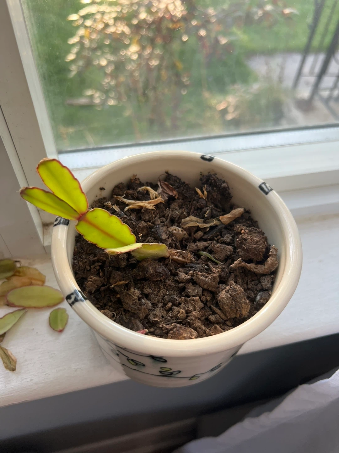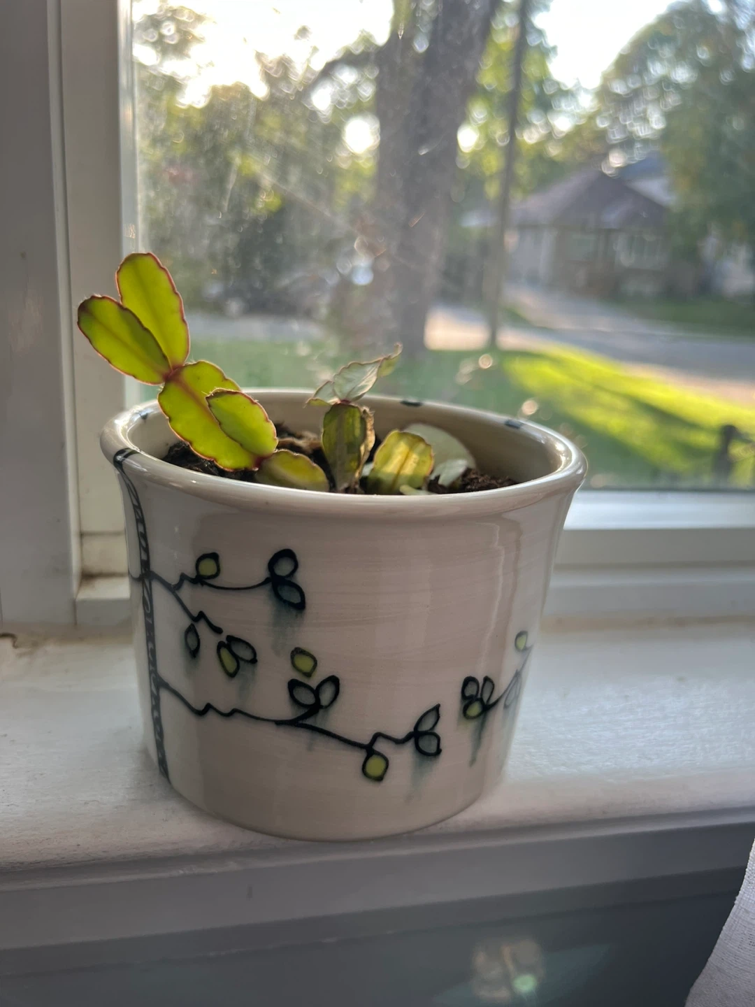 Selling a potted Christmas cactus. It's in a cute pot with a vine design. This plant is easy to care for and adds a touch of green to any space