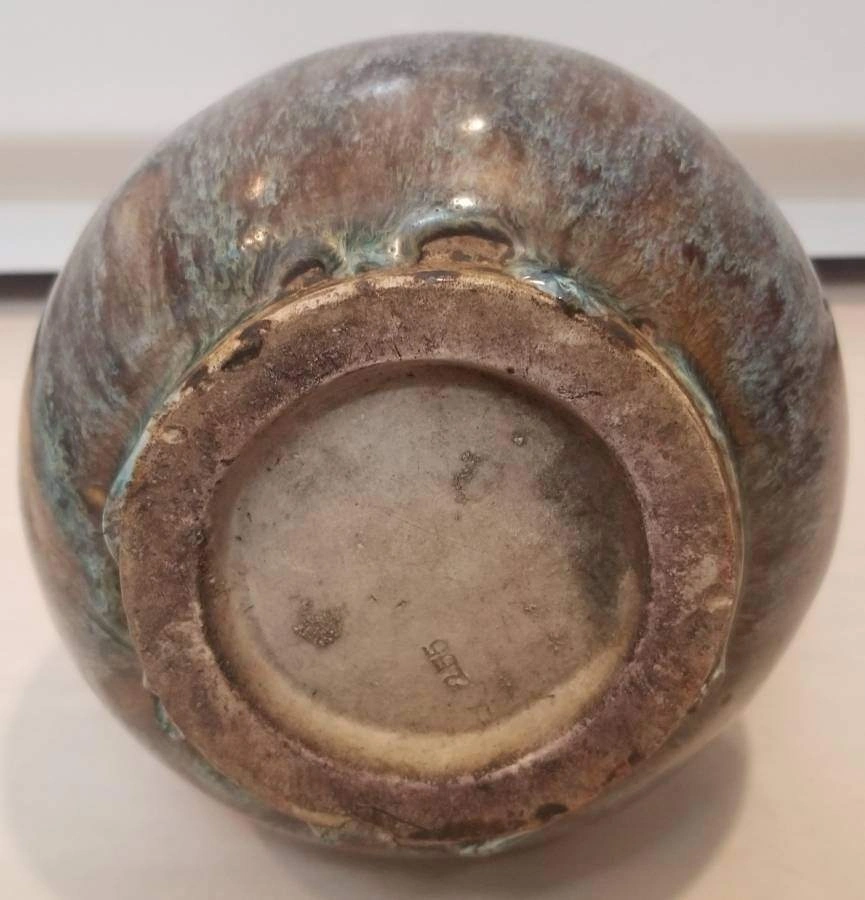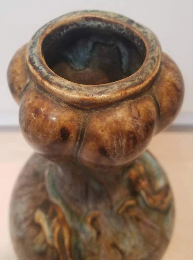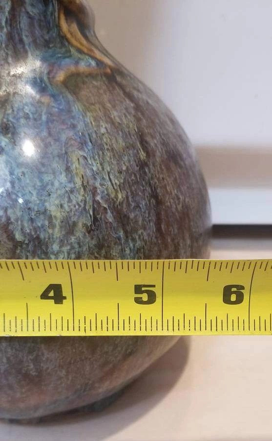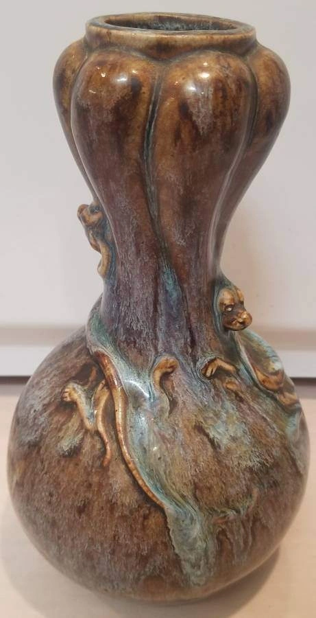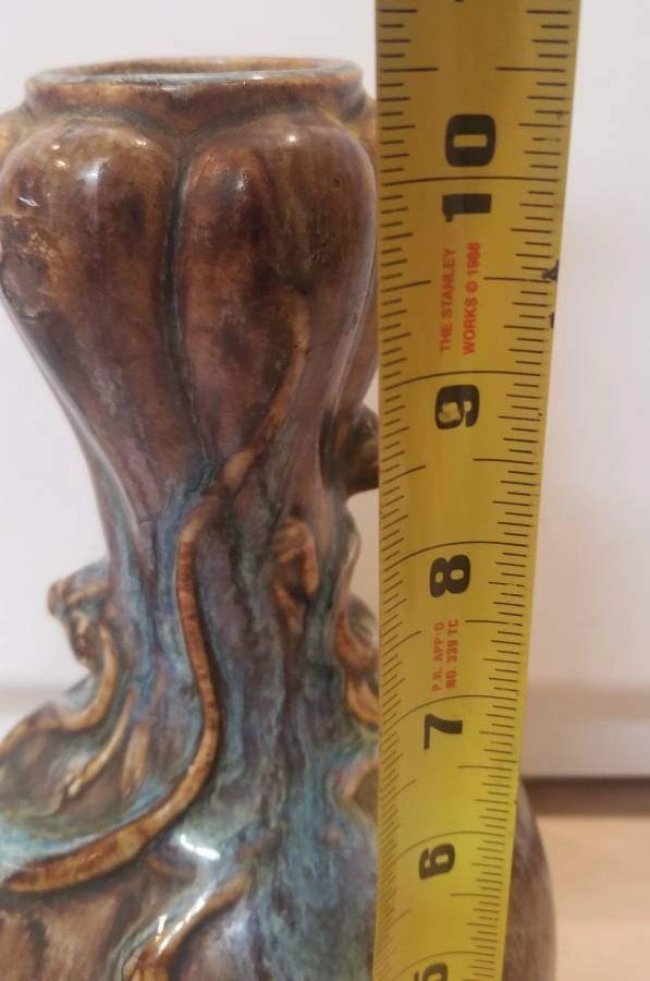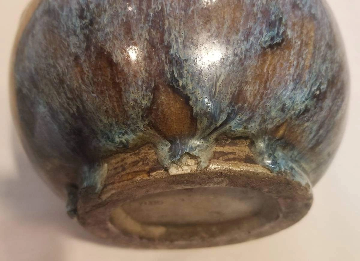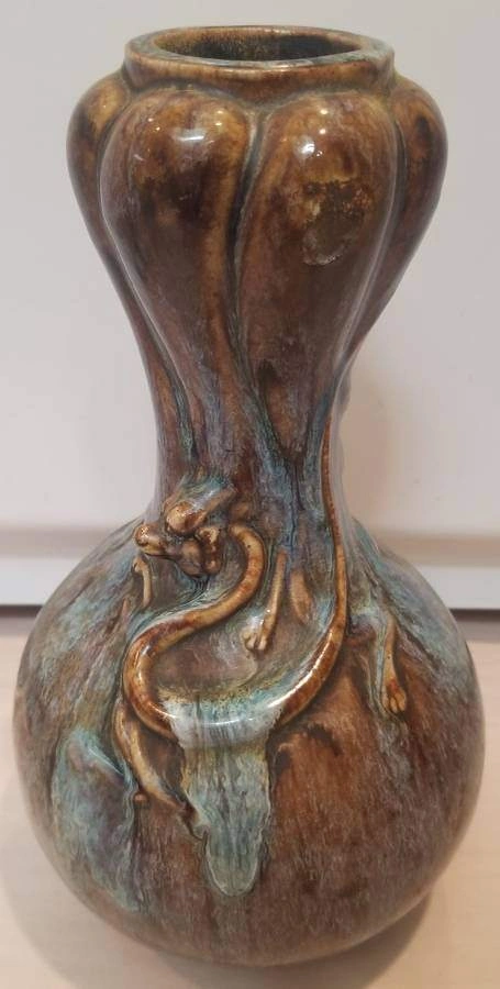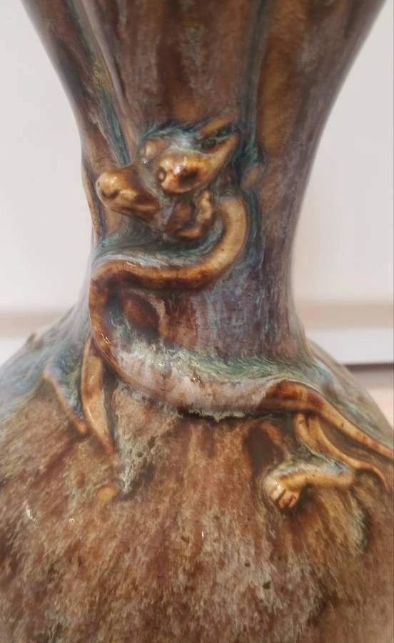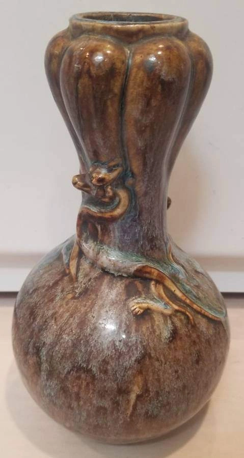Vintage Chinese Dragon Vase – Applied Relief, Drip Glaze, 10.5" E-Transfers Accepted Pick Up Anytime Striking vintage Chinese-style pottery vase featuring a dramatic applied dragon in high relief climbing around the neck and shoulder. Finished with a rich multicolour drip glaze in earthy browns, greens, and blues, highlighted by intentional surface crazing for character. Size: 10.5" tall × 5.5" wide Material: Stoneware / pottery with multicolour drip glaze Features: Applied dragon motif in high relief wrapping around the body Base: Impressed mold/production number Condition: Good vintage condition with minor firing flaws and age-appropriate wear; solid display piece A bold decorative statement and a collectible piece of mid-20th century Chinese-inspired pottery. Excellent for collectors of dragon motifs, Asian décor, or vintage studio ceramics. dragon vase pottery asian drip glaze vase vintage relief dragon ceramic chinese style decorative pottery mid century studio art vase