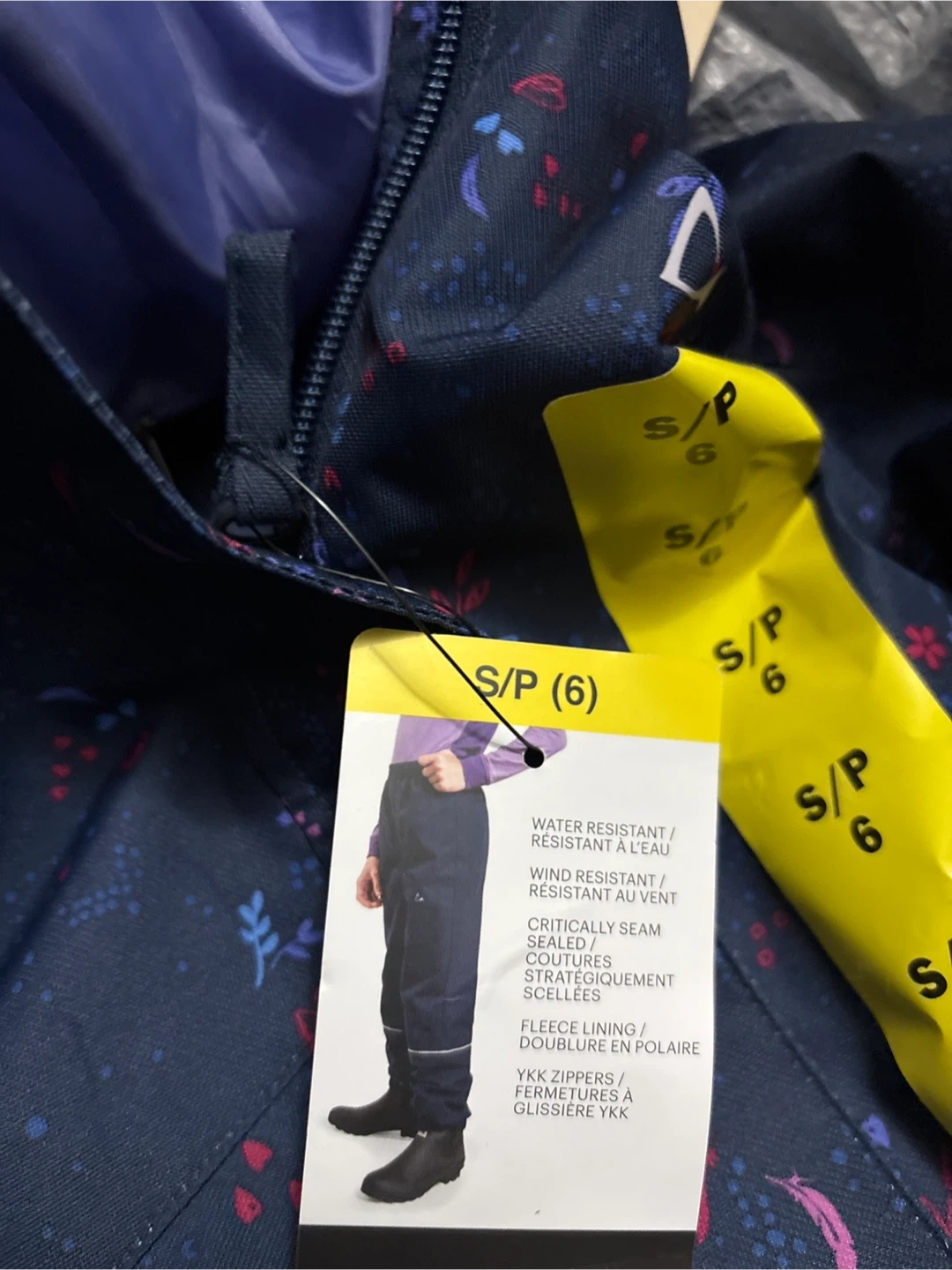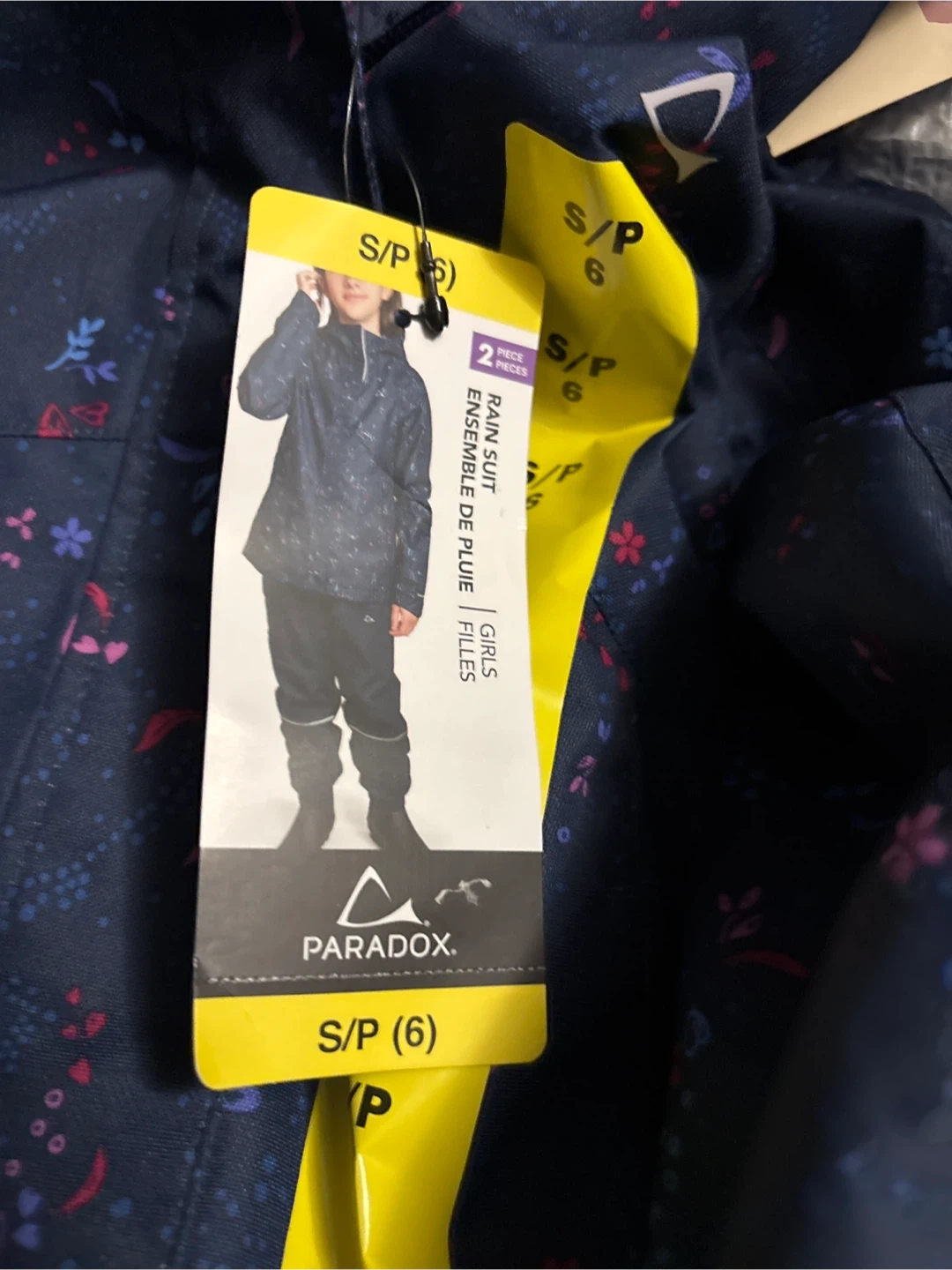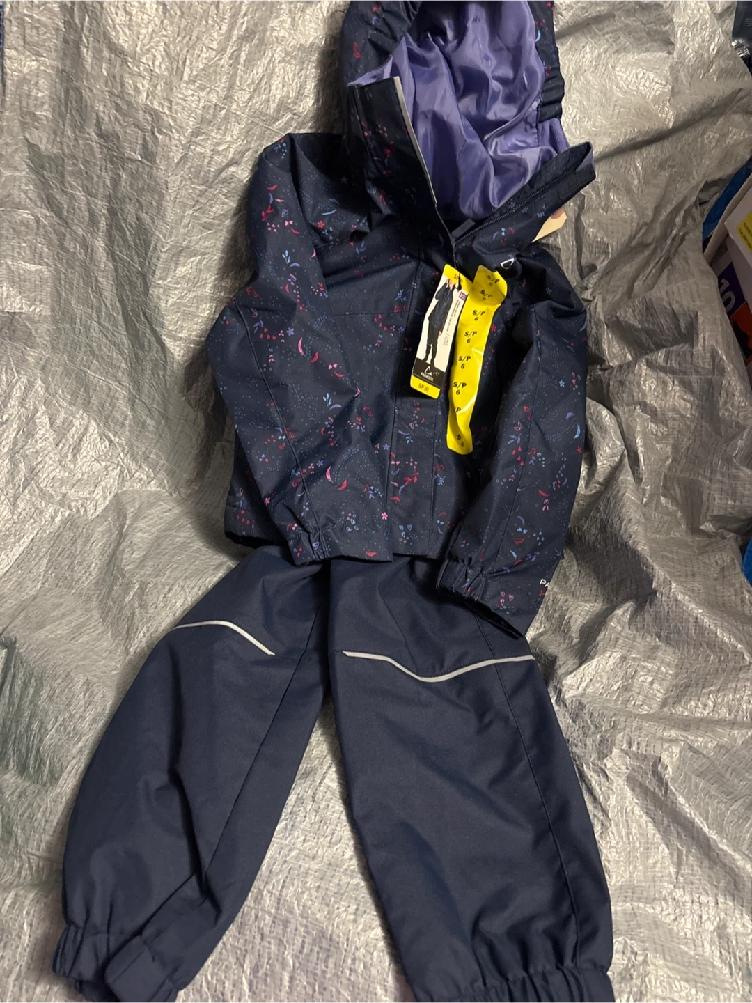 Selling a brand new Paradox girls' rain suit in size S/P (6)! This 2-piece set is perfect for keeping your little one dry and comfortable on rainy days. It's water-resistant and wind-resistant, with critically seam-sealed construction. The suit also features a cozy fleece lining and YKK zippers for durability