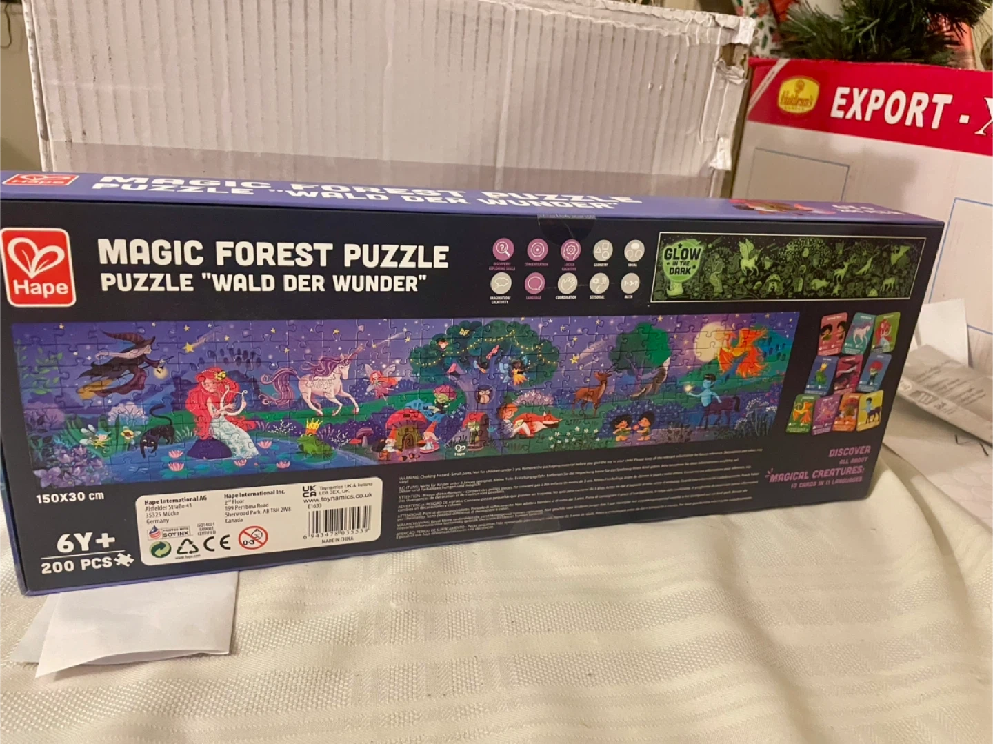 Get ready for a magical adventure with this Hape Magic Forest Puzzle! It glows in the dark, making it extra fun for kids aged 6 and up. The puzzle includes 200 pieces and features 10 fun facts cards. It measures 1.5 meters long when completed. Perfect for hours of entertainment!
