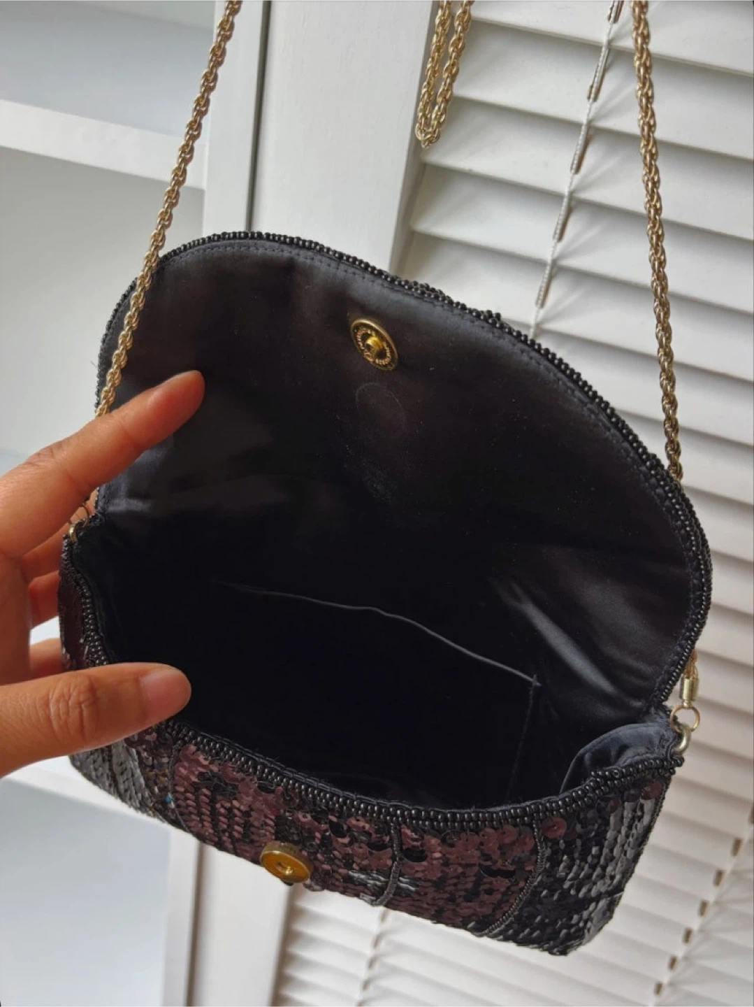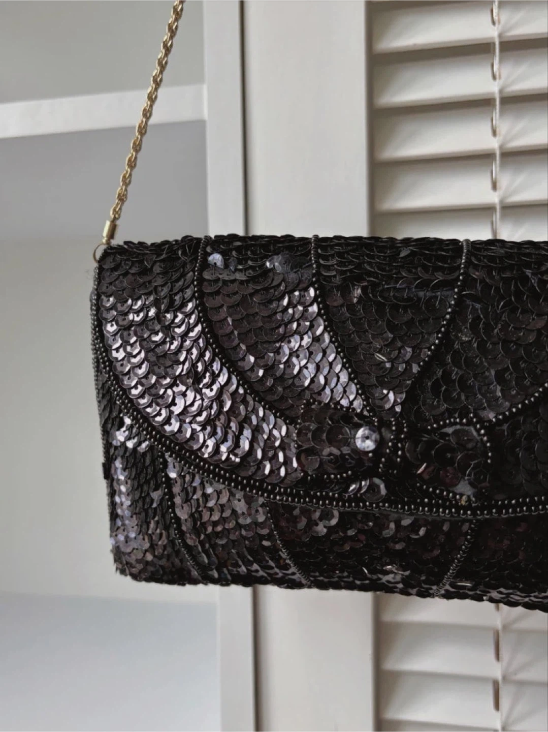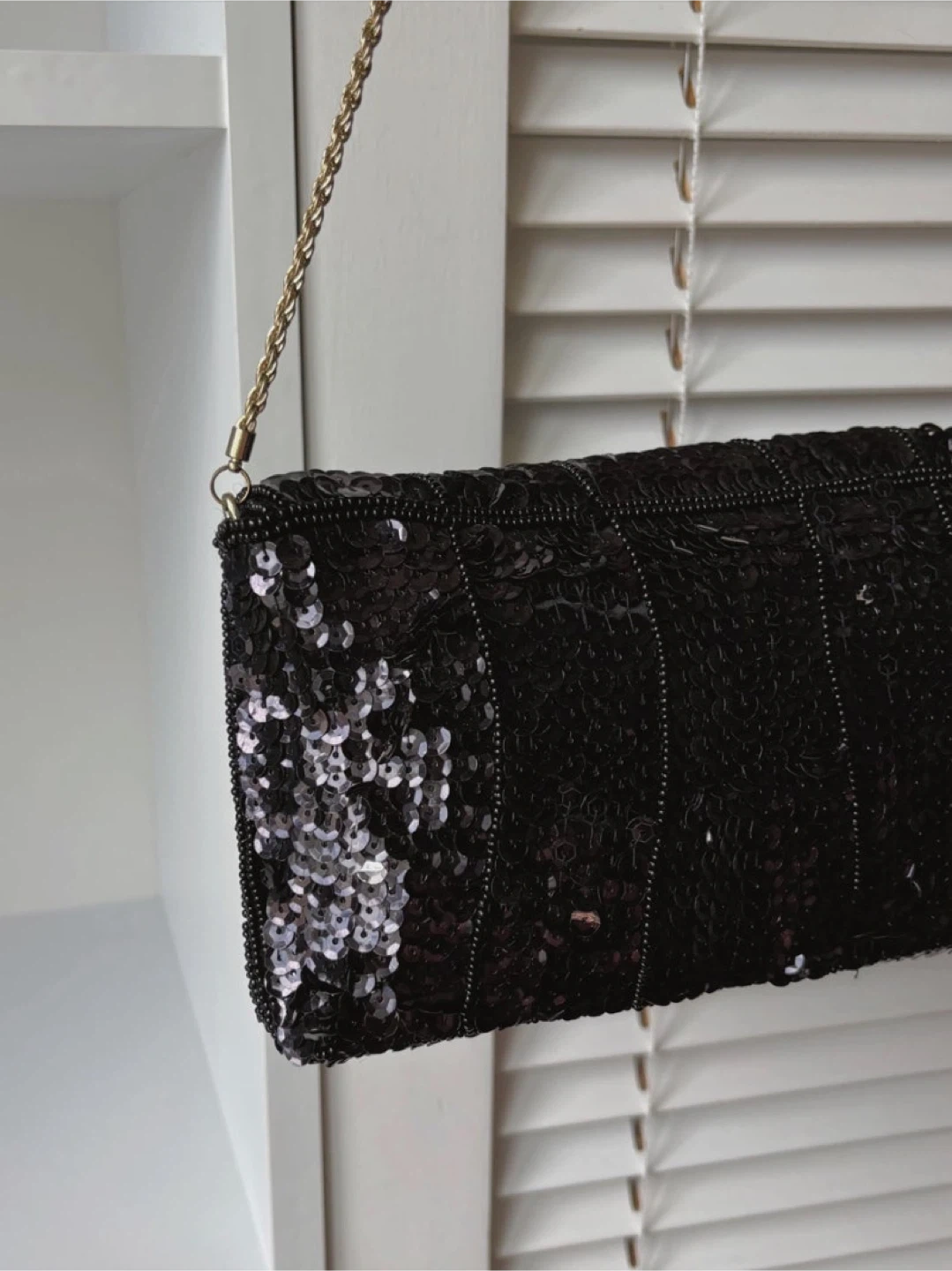šŸ“Œ Description: A stunning vintage sequin and beaded evening bag with an elegant ribbon detail on the front flap. Perfect as a crossbody or shoulder purse, this versatile piece is ideal for weddings, cocktail parties, formal events, or adding a touch of glamour to your everyday look. The shimmering sequins and beaded accents create a timeless design, while the gold-tone chain strap adds sophistication. āœ” Material: • Exterior: Sequins and beads • Interior: Fabric lining • Chain strap: Metal āœ” Size (approx.): • Width: 20 cm (7.8ā€) • Height: 12 cm (4.7ā€) āœ” Features: • Vintage sequin and beaded construction with ribbon detail • Front flap with secure snap closure • Interior fabric lining with small slip pocket • Gold-tone chain strap for shoulder or crossbody wear • Lightweight yet structured design šŸ“Œ Condition: • Overall in excellent vintage or secondhand condition. Due to the nature of items, there may be minor signs of wear, such as slight stains or small imperfections.