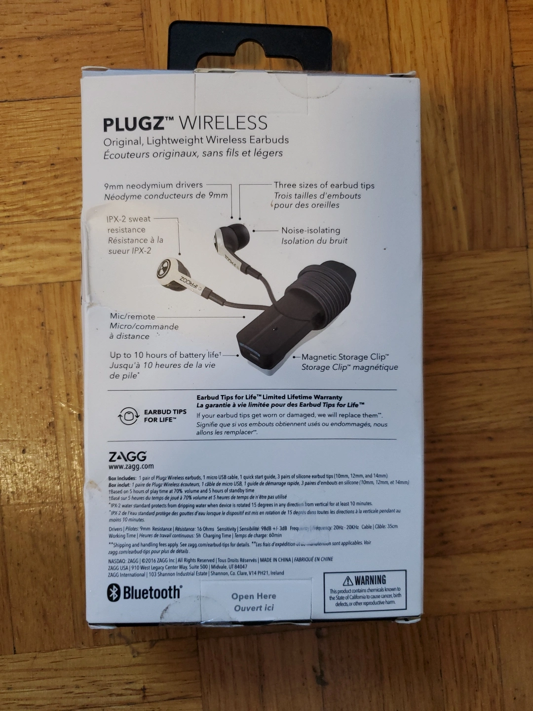Selling a brand new set of iFrogz Plugz Wireless Earbuds with a mic! These earbuds are lightweight and designed for comfort. They feature 9mm neodymium drivers and are sweat resistant with an IPX-2 rating. You'll get up to 10 hours of battery life. The box includes three sizes of earbud tips for a perfect fit. Also comes with a wireless clip with mic + remote and a magnetic storage clip