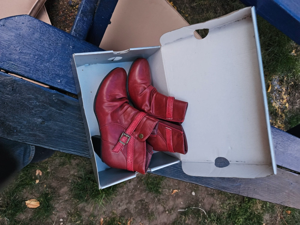 25Selling a pair of red ankle boots. They feature a stylish buckle detail and come in their original box. Perfect for adding a pop of colour to your wardrobe! as Nancy sang, "these boots were made for walking "