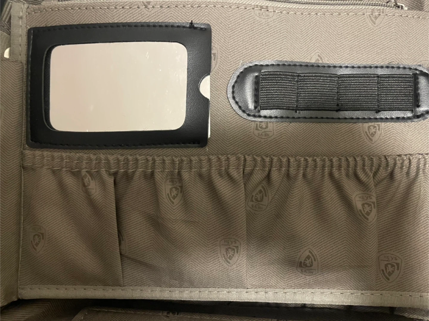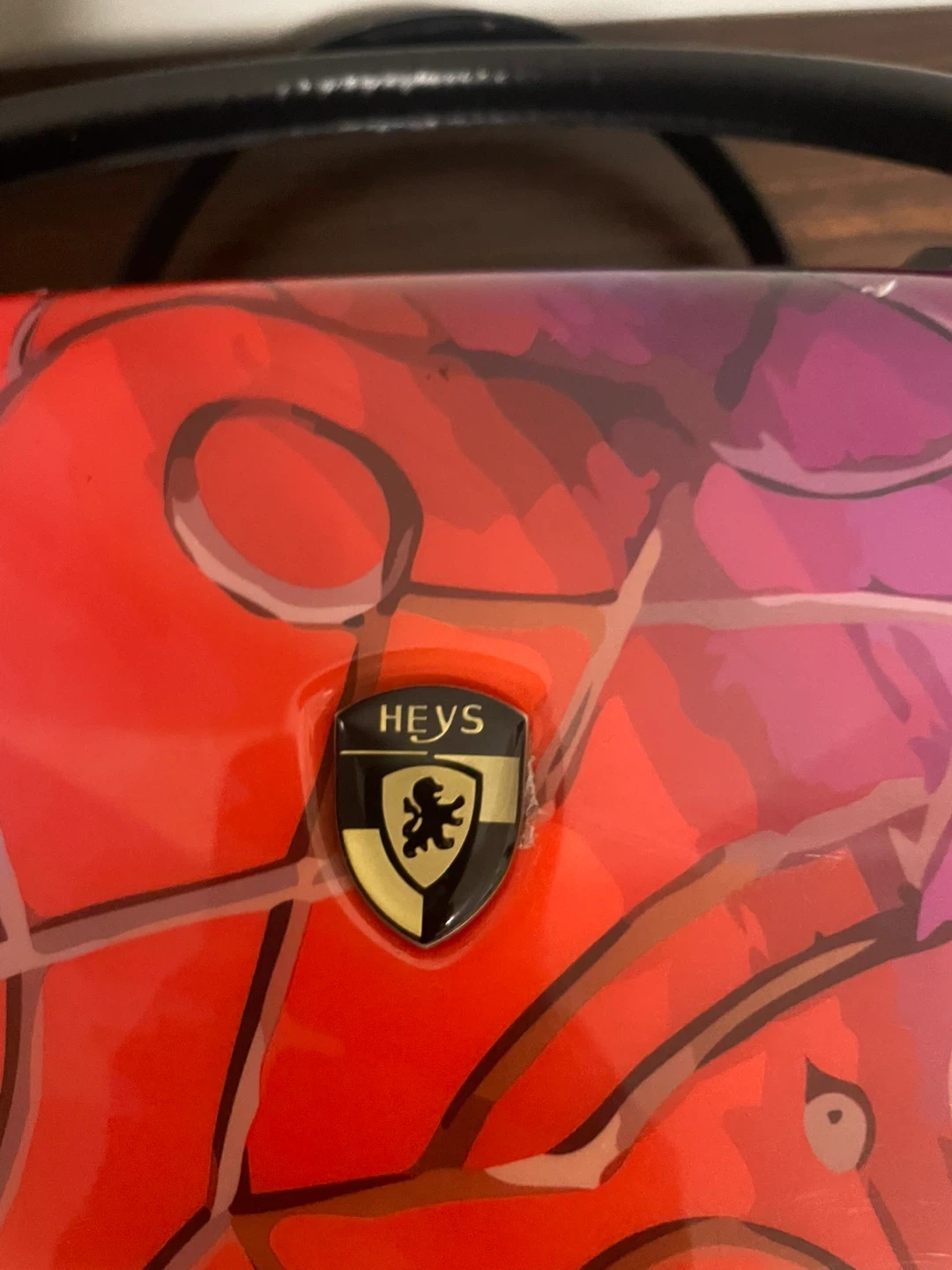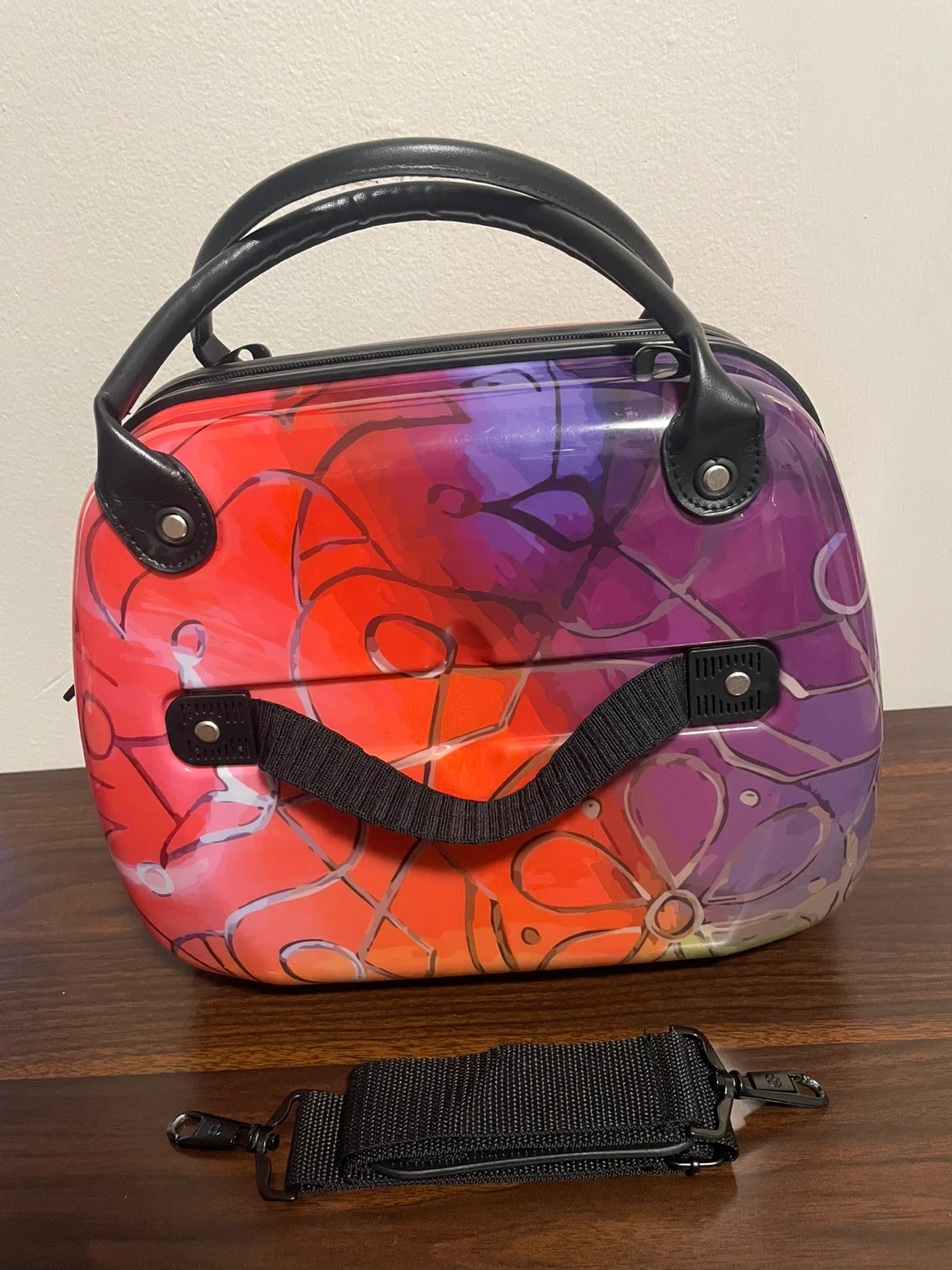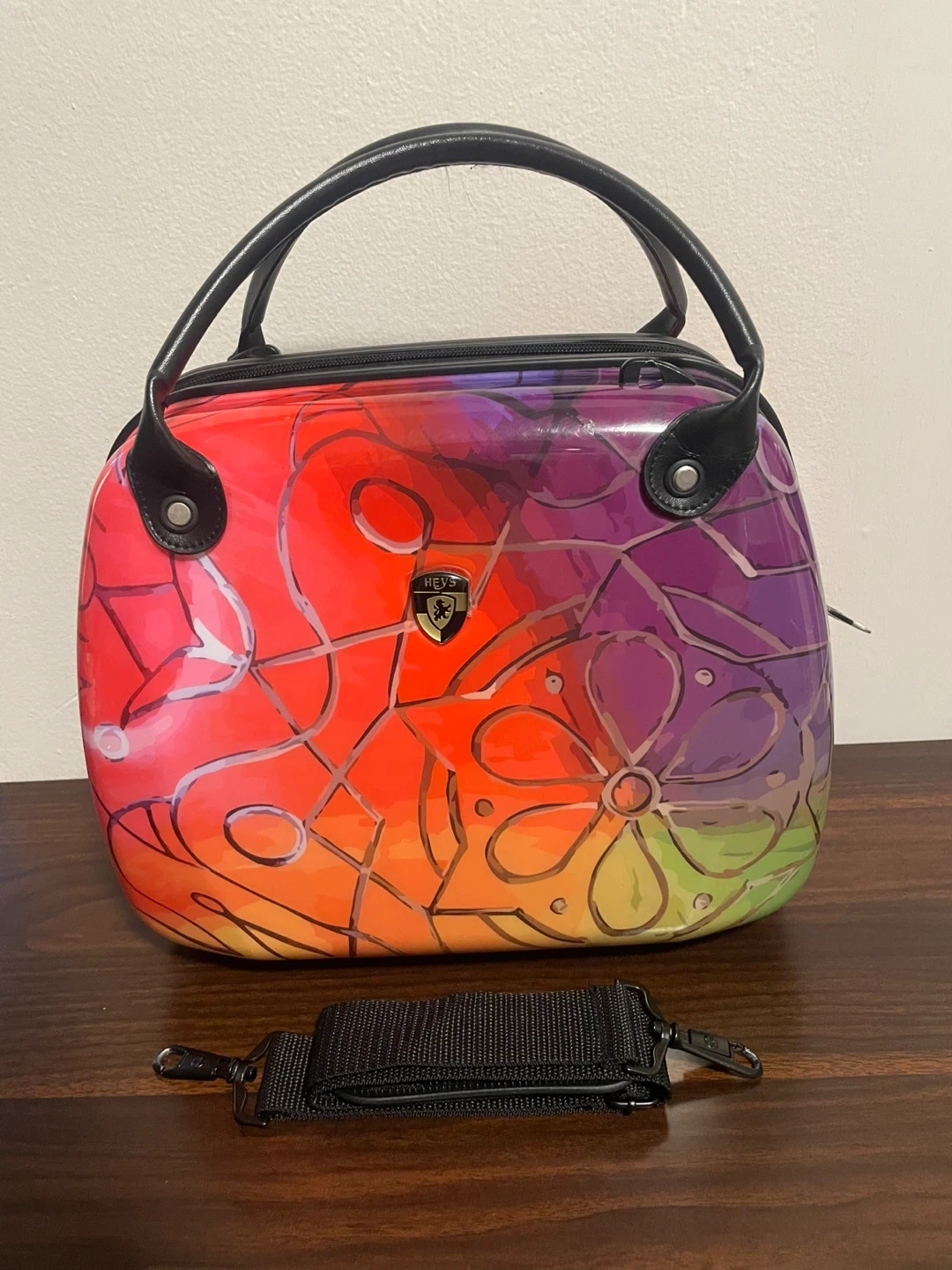 Heys International Bellezza Hard-Sided Travel Case This is a beautiful and functional Heys International Bellezza case, perfect for standing out on your next trip! It's an ideal size for a cosmetic/makeup train case, a toiletry bag, or a mini overnight/carry-on tote. Key Features: • Brand: Heys International (Canada, Est. 1986). • Style: Hard shell case from the Bellezza collection. • Design: Eye-catching, vibrant abstract floral/stained glass-style pattern in shades of red, orange, purple, and green. • Carrying Options: Features a structured top handle and includes a removable/adjustable black shoulder strap for versatile carrying.