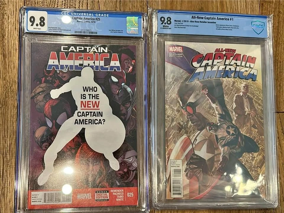 Captain America 25 Cgc 9.8 All new captain America 1 cgcs 9.8 Ross variant Selling as a lot for $120 Pickup south Burlington