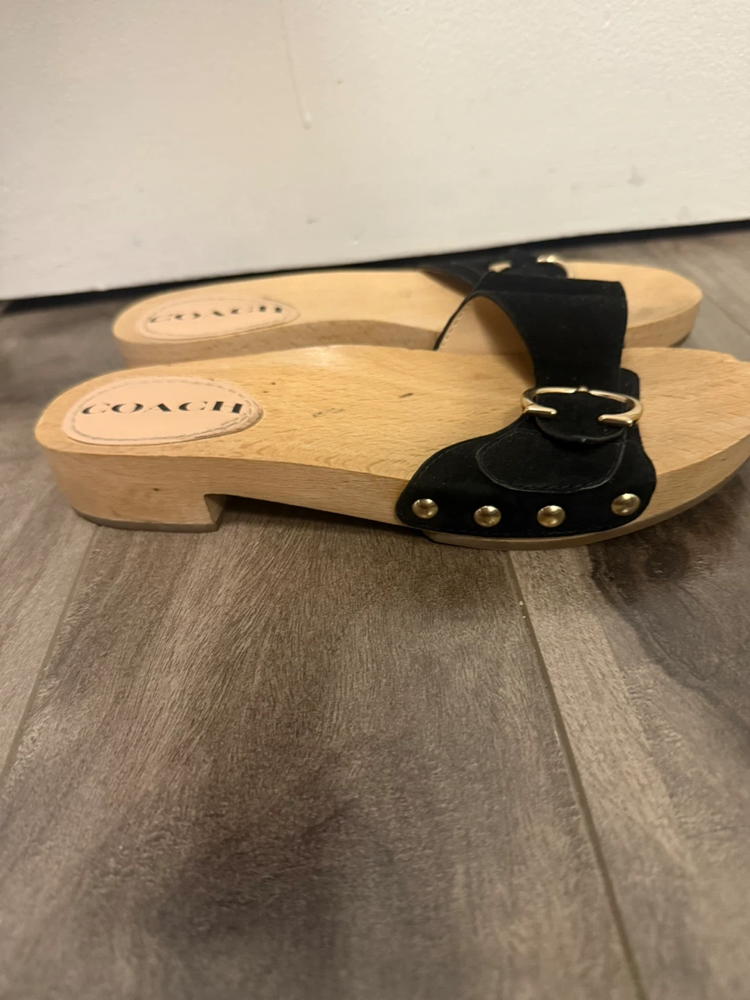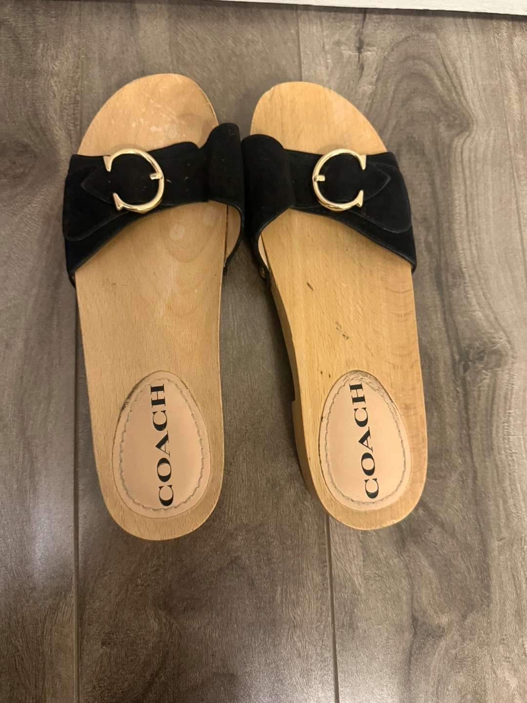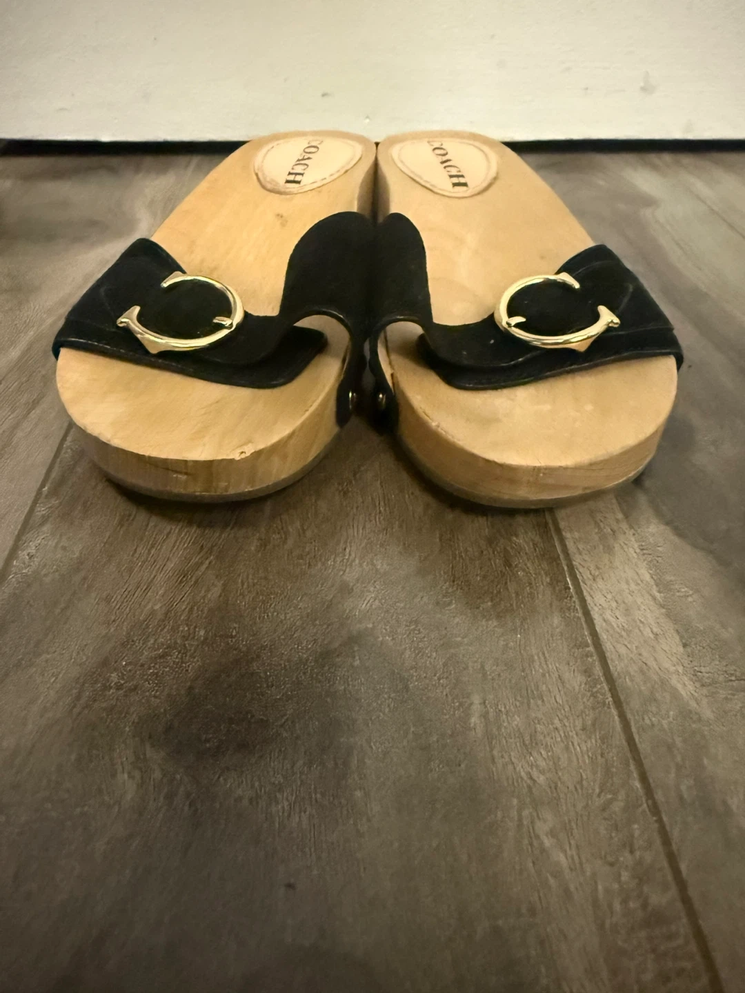 Selling a pair of Coach clog sandals! They feature a black leather strap with a gold buckle on a wooden sole. Great for a casual, stylish look!