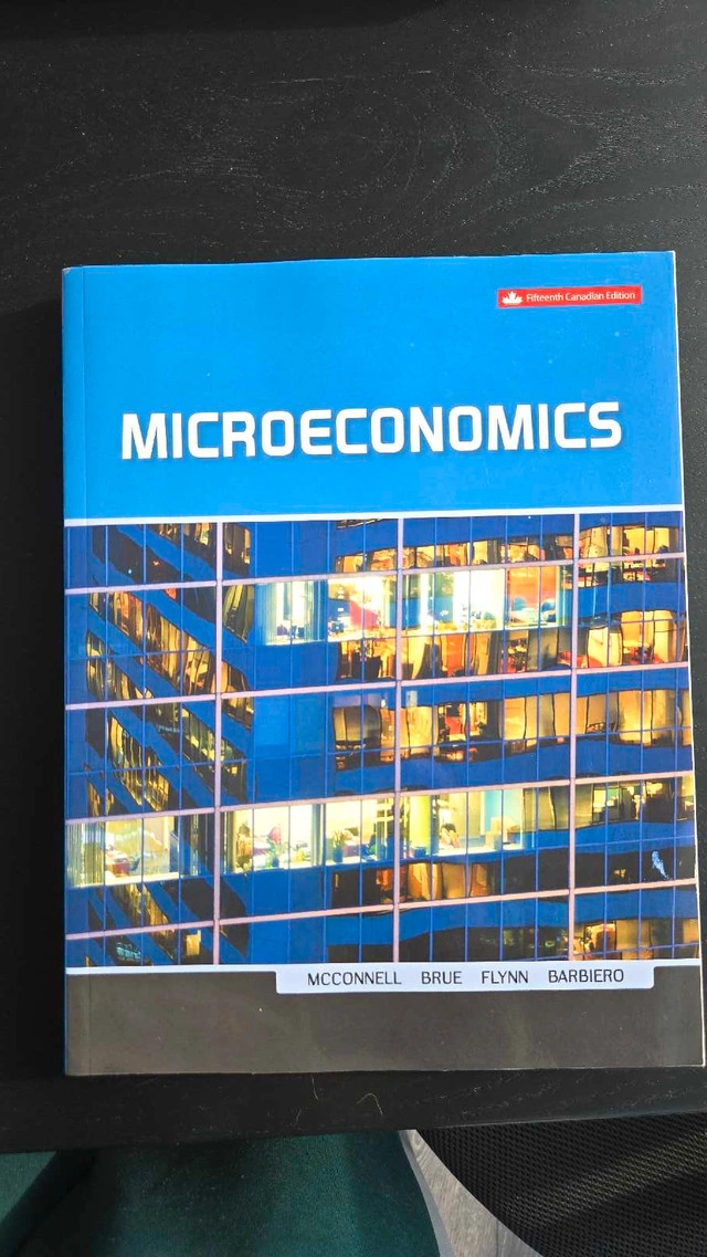 Up for grabs is the "Microeconomics Fifteenth Canadian Edition" textbook by McConnell, Brue, Flynn, and Barbiero, perfect for any economics student! This book is in good condition, with all pages intact and ready for studying. Additional details: * Authors: McConnell, Brue, Flynn, Barbiero * Edition: Fifteenth Canadian Edition * Publisher: McGraw-Hill If you're seeing this ad, the book is still available.