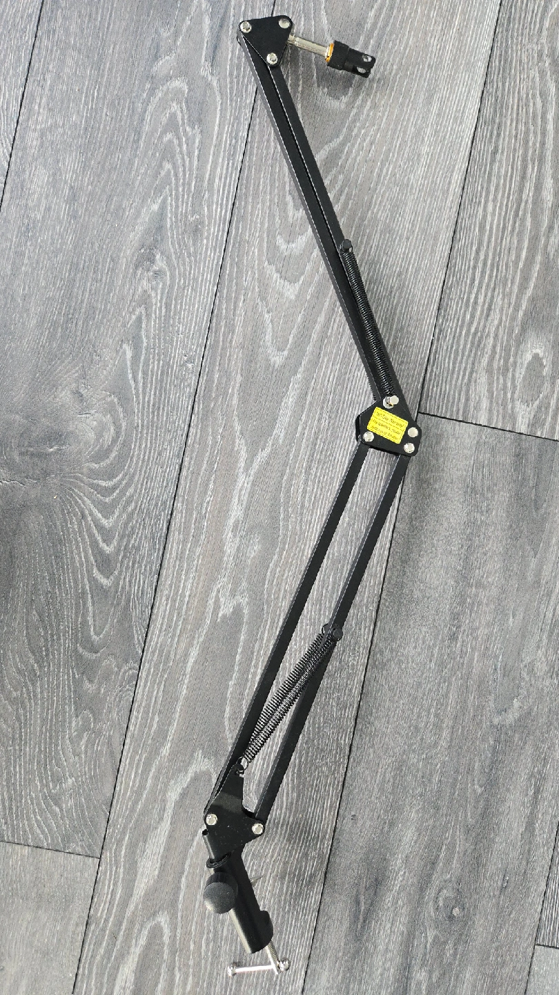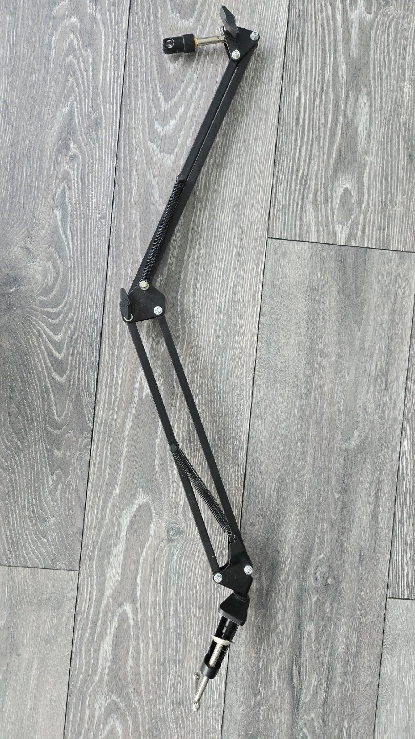 Elevate your audio setup with this used microphone scissor arm stand, perfect for podcasts, broadcasts, or home studios! It's in good working condition, ready to bring flexibility and convenience to your recording space. Additional specs: * Adjustable arm for optimal positioning * Sturdy clamp base for secure mounting * Metal construction for durability.