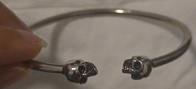 This is a used skull bracelet featuring a unique skull design on each end, perfect for adding an edgy touch to any outfit. Being sold at a great price!