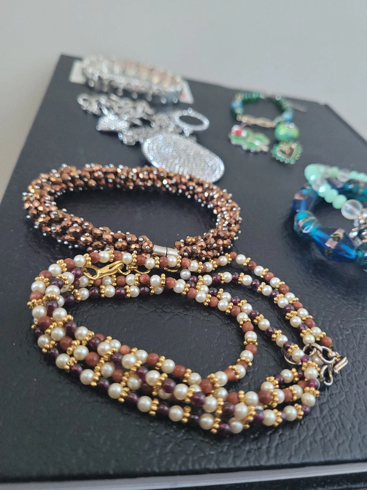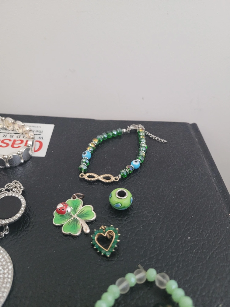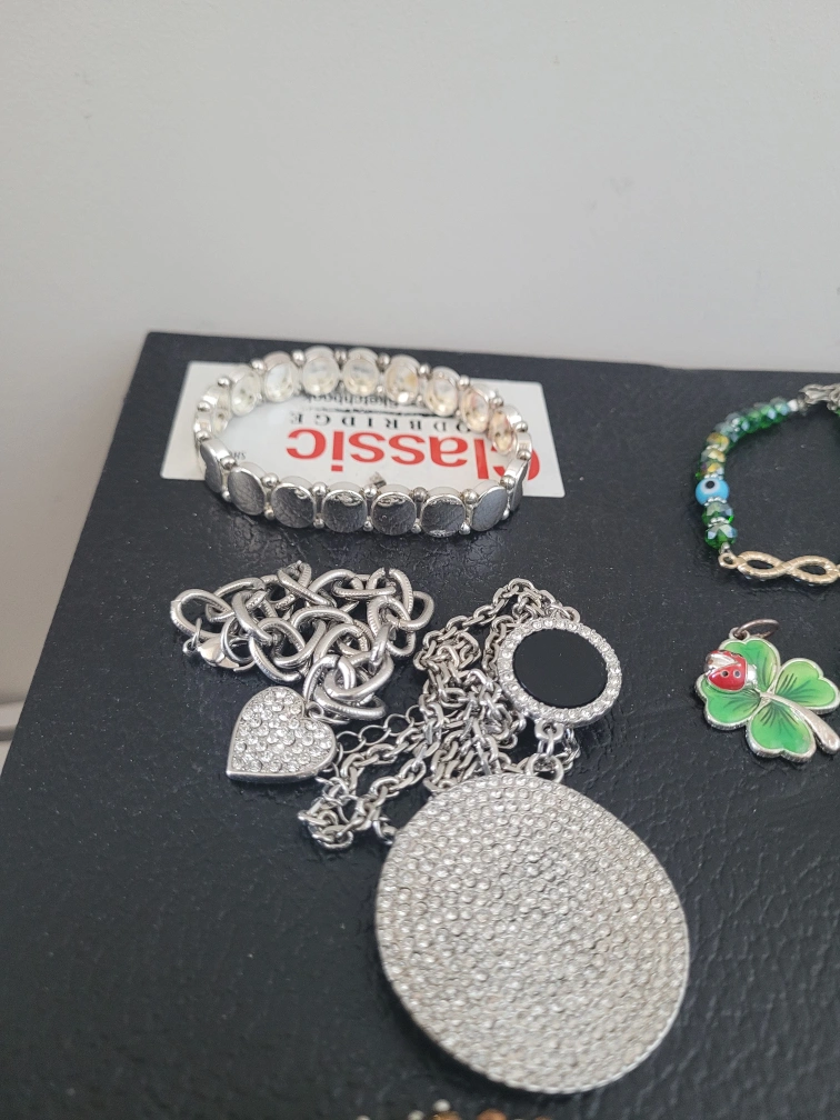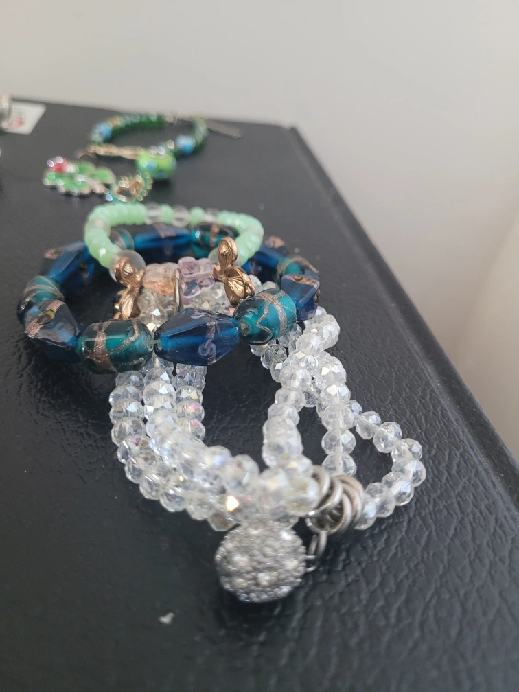 A collection of assorted costume jewellery including necklaces and bracelets. Perfect for adding a bit of sparkle to any outfit! Each set $5 or all for $15 Set 1 brown beaded bracelets and two beaded necklaces Set 2 silver tone necklace and bracelets Set 3 beaded evil eye bracelet lucky ladybug/clover pendant pandora style charm and grean jeweled heart pendant set 4 bee charm beaded bracelet, blue glass bead bracelet and triple bracelet with jeweled ball charm