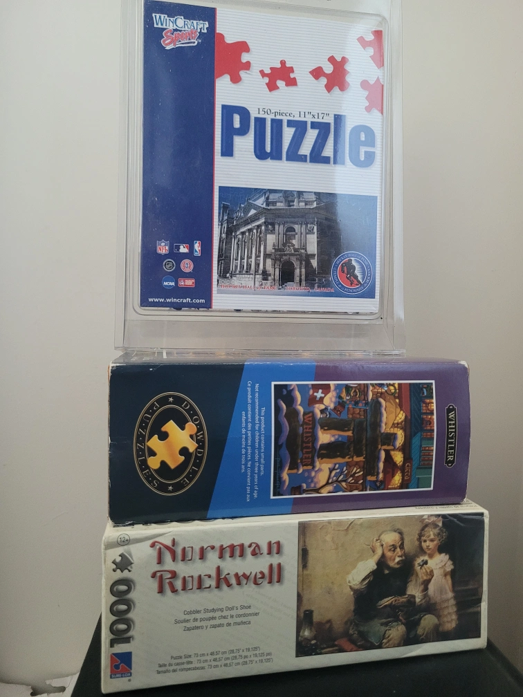 Selling a bundle of three puzzles! Includes a Wincraft 150-piece puzzle, a Whistler 500 piece puzzle, and a Norman Rockwell 1000-piece puzzle $10 each or all $25 Cash or open to trades