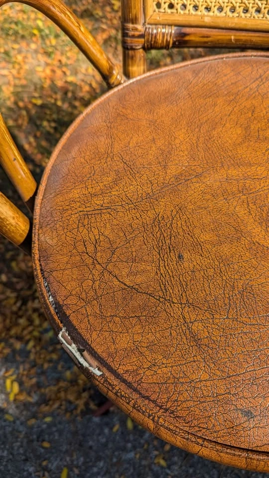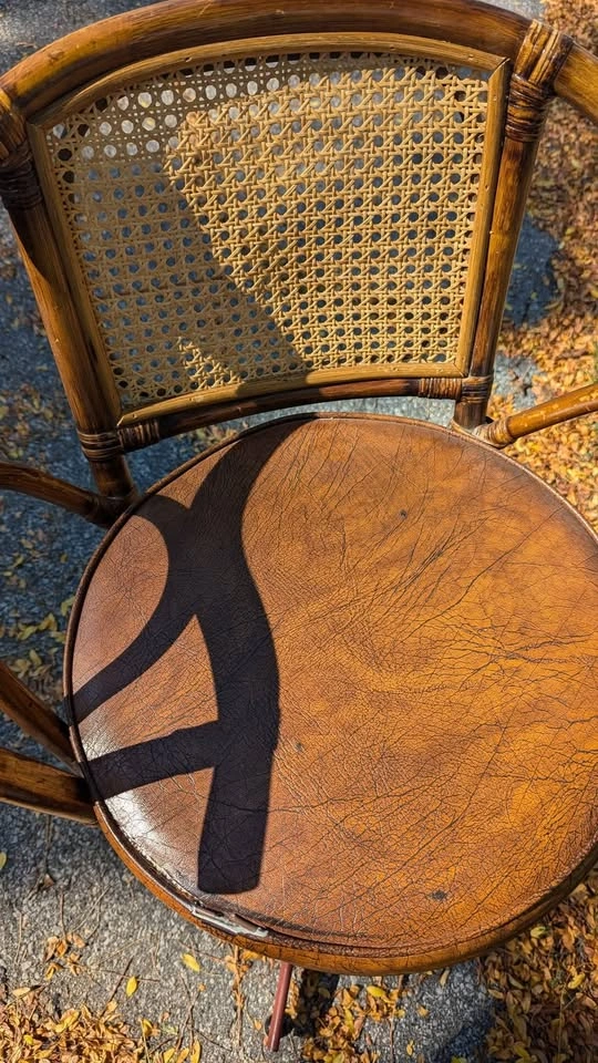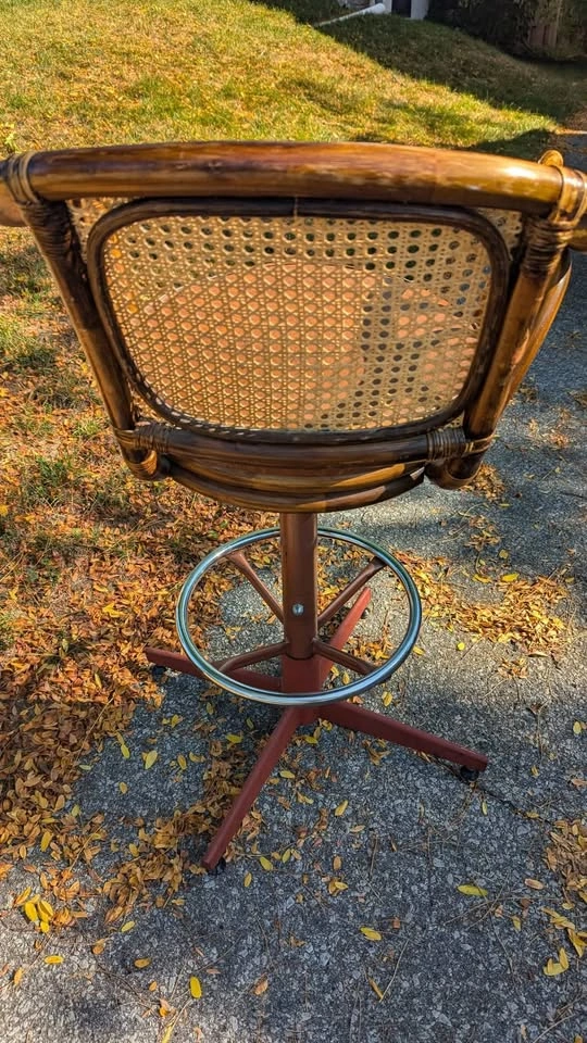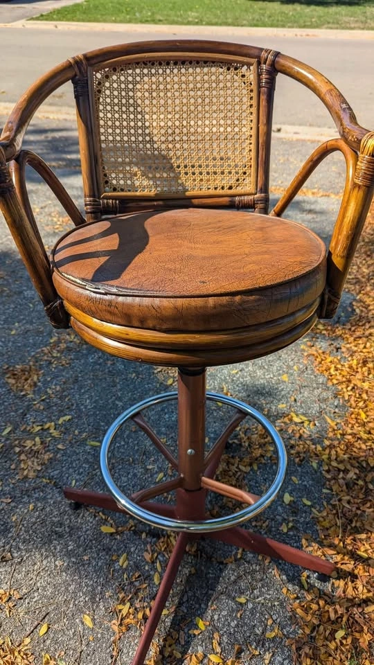 Unique vintage swivel bar stool with rattan frame, cane back, and padded faux-leather seat. Retro metal base with footrest. Size: 22”W x 17”D x 38”H Swivels smoothly Seat shows age/wear and has some cracks/tears (see photos) Frame feels a bit wobbly, but could be tightened or fixed up Great candidate for a DIY refurbish, or use as-is for a cool retro vibe Pick up Burlington