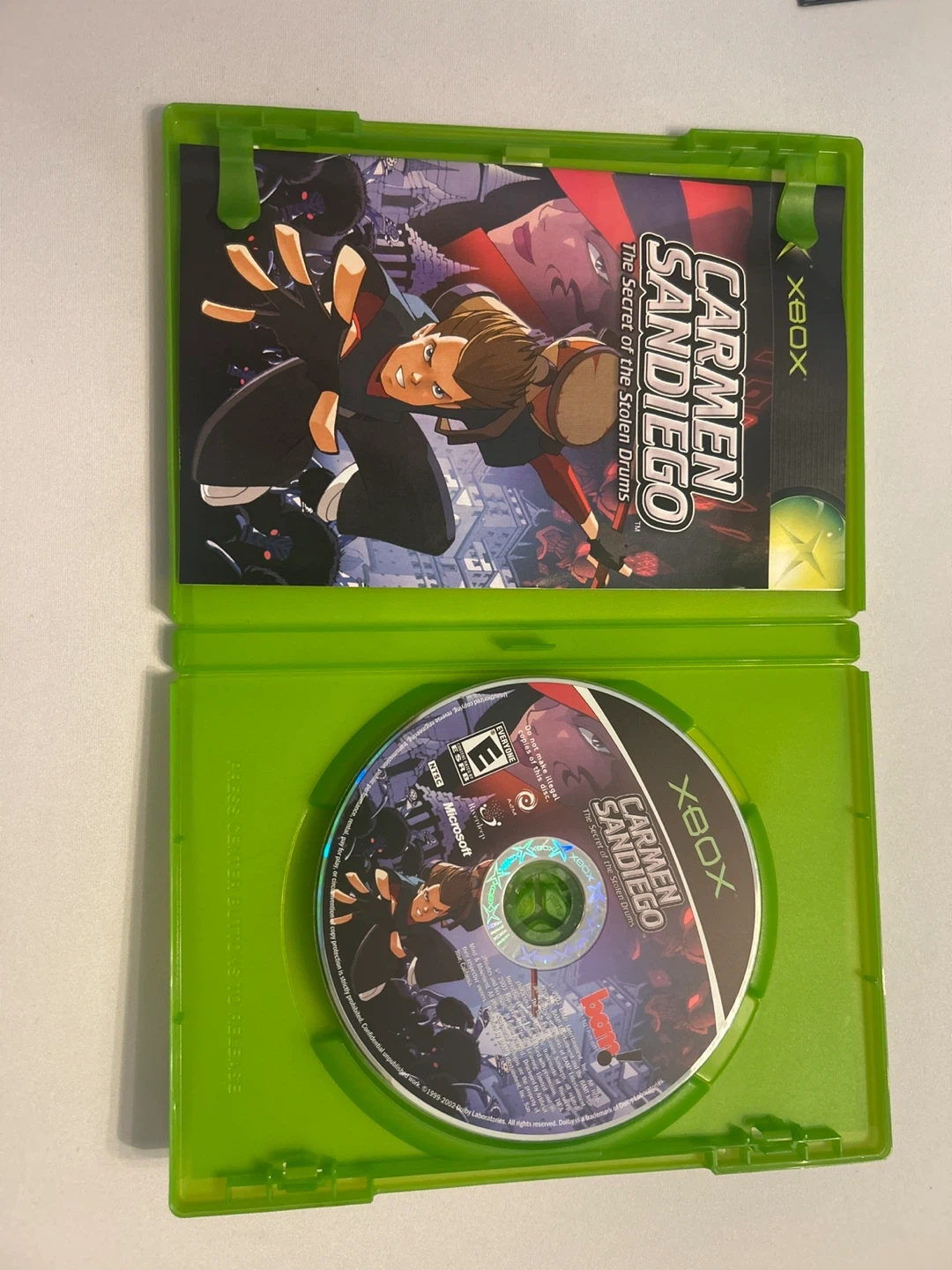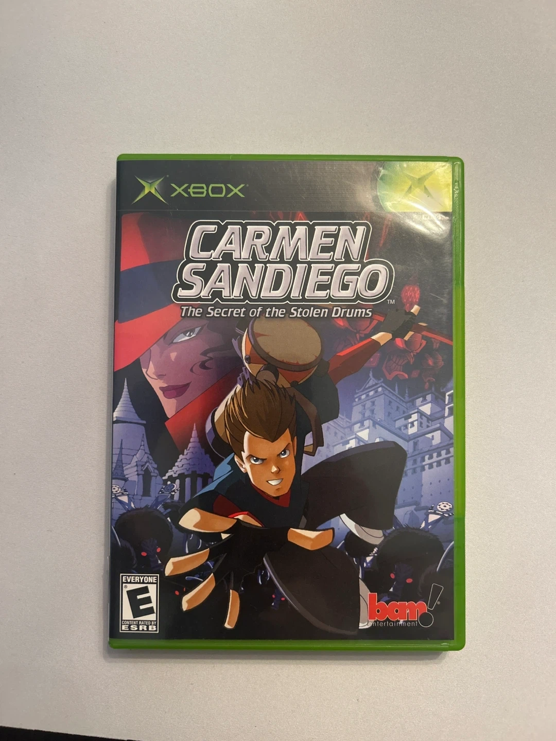 Selling the Xbox game, Carmen Sandiego: The Secret of the Stolen Drums! It's rated E for Everyone and features fantasy violence. Use sneaking, crouching, and rolling to get the drop on your opponents. Engage and outwit the elemental spirits, protecting the path to the stolen drums. Travel to nine exotic locations in your quest for Carmen Sandiego!