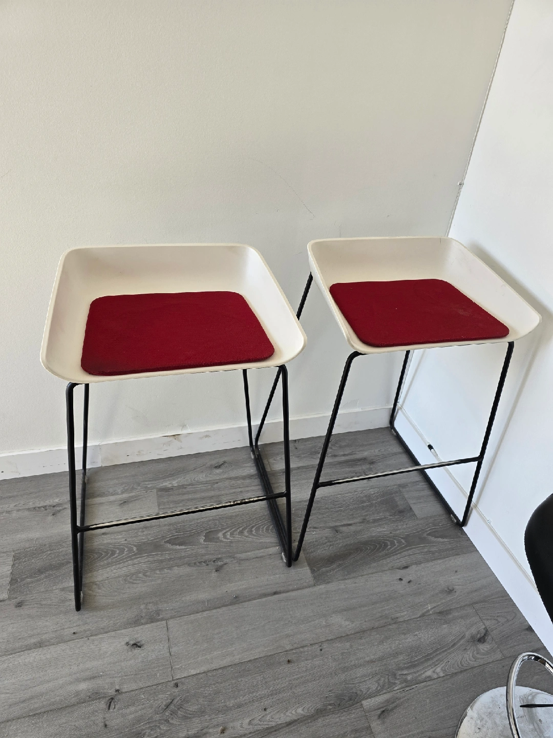 Selling a pair of modern bar stools! They feature a clean white seat with a vibrant red cushion, perfect for adding a pop of colour to your kitchen or bar area. The black metal legs provide a sturdy and stylish base
