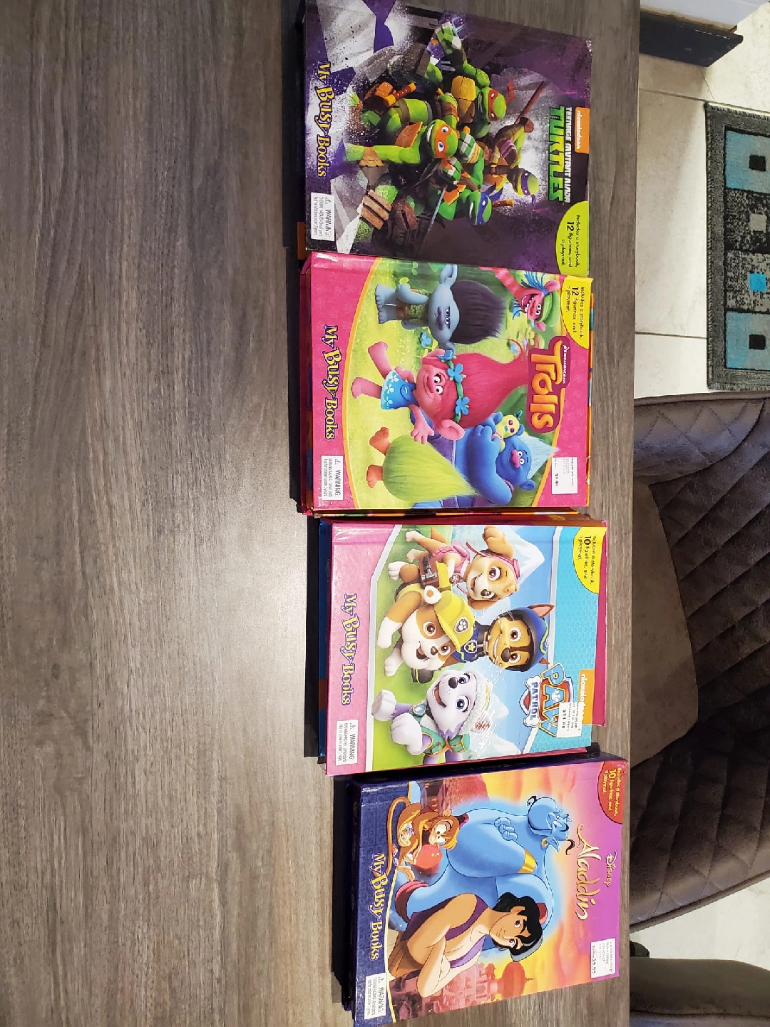 Selling a bundle of 'My Busy Books' for kids! Includes titles like Aladdin, Paw Patrol, Trolls, and Teenage Mutant Ninja Turtles. Each book includes a storybook, 12 figurines, and a playmat. Great for keeping the little ones entertained $8 each