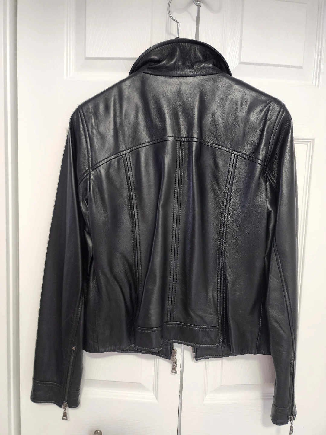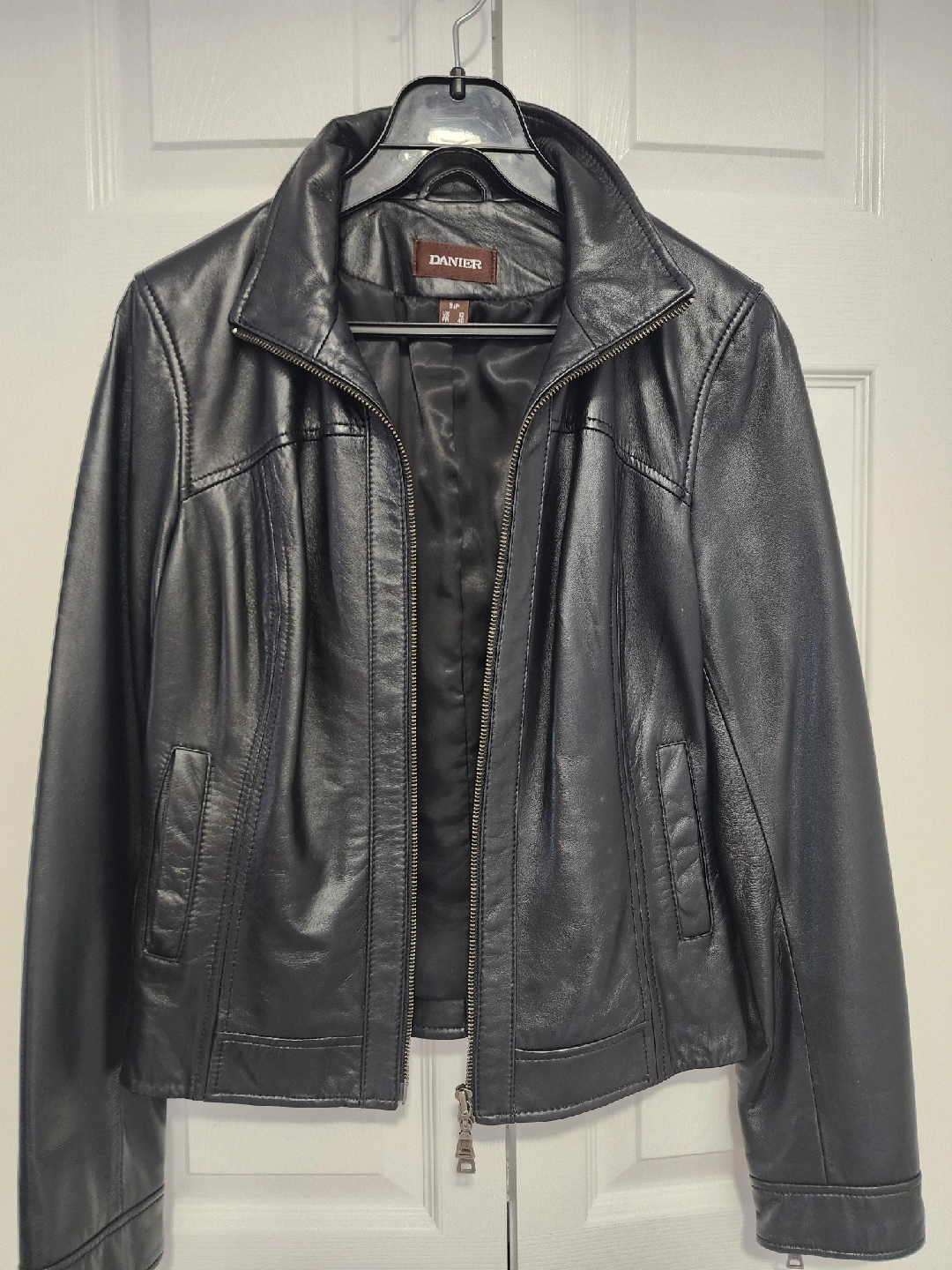 Selling a stylish Danier black leather jacket in size S/P. It's in great condition and perfect for adding a touch of sophistication to any outfit. The jacket features a classic design with a zippered front and sleek silhouette. A must-have for your wardrobe!
