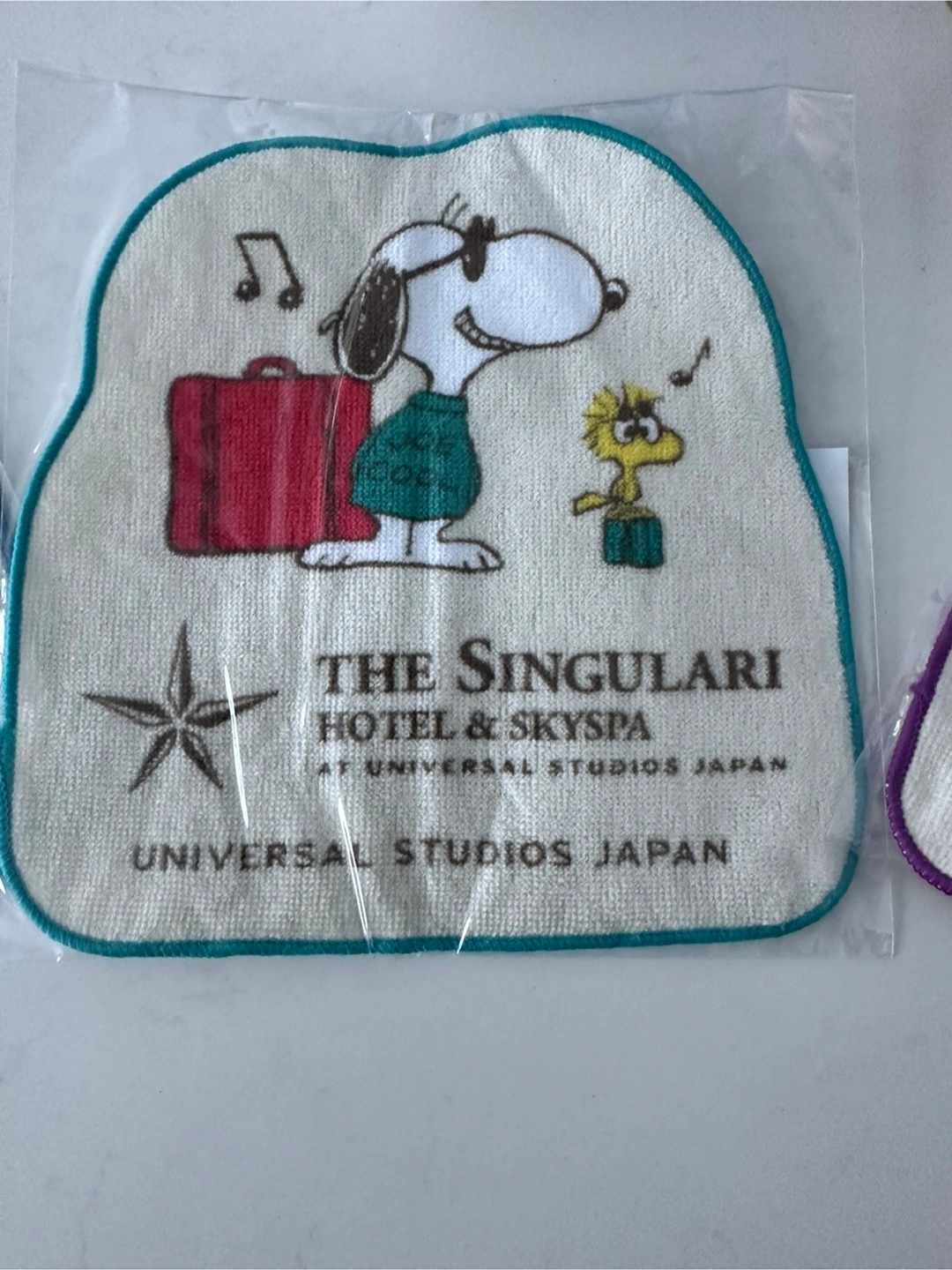 Brand new adorable Snoopy hand / face towels lot of 3, from Universal Studios Japan! They feature Snoopy and Woodstock with a suitcase. Perfect for a trip to the spa or just to add a touch of fun to your bathroom. Size: 200 mm x 200 mm, cotton.