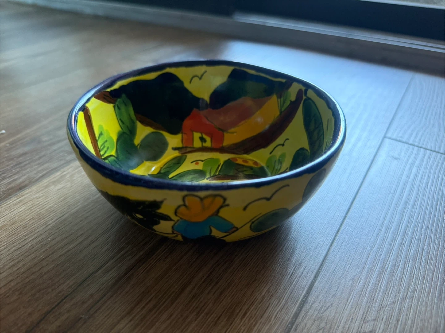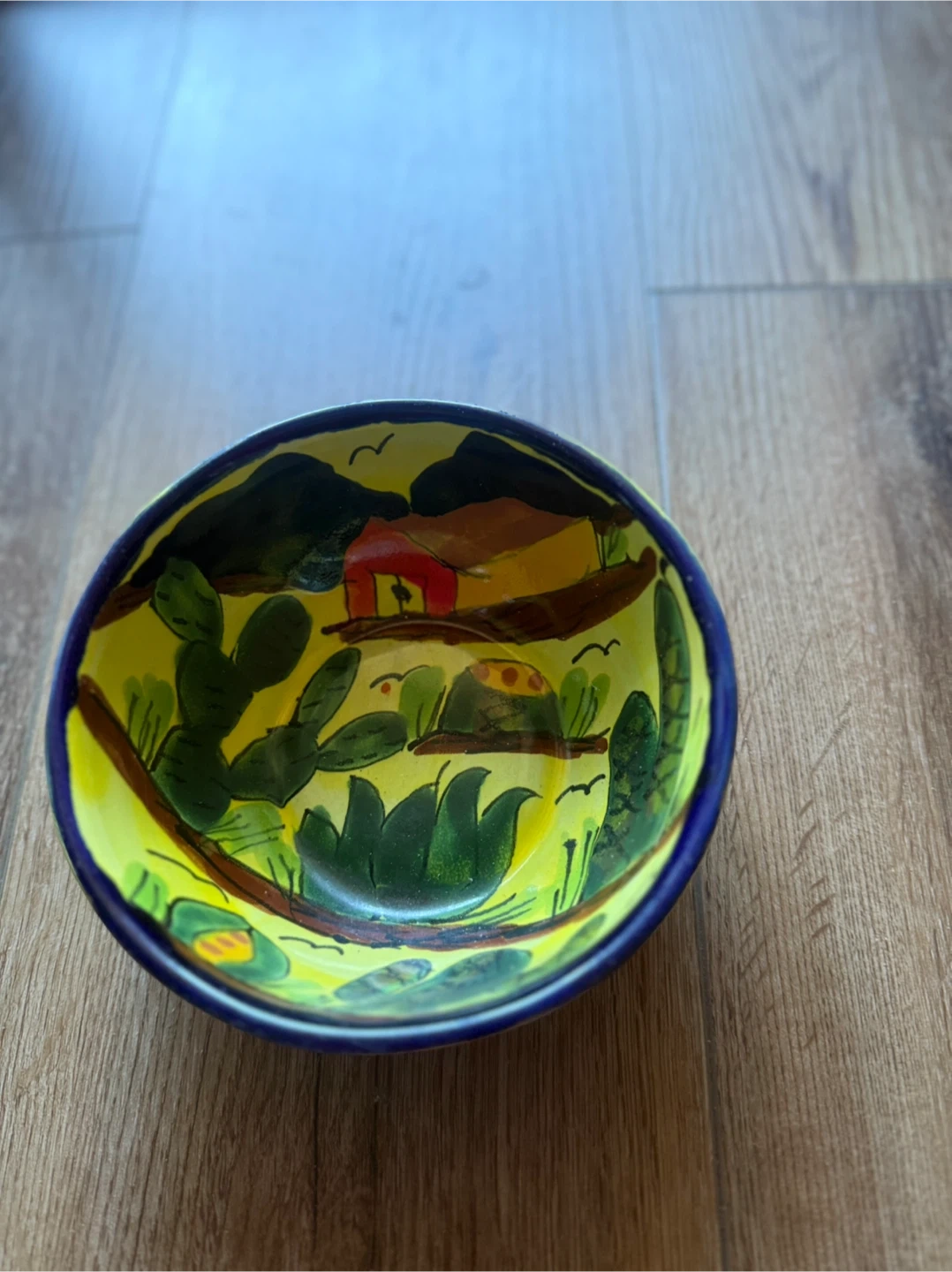 Selling a cute hand-painted decorative bowl. It features a vibrant yellow background with a charming scene of cacti, mountains, and a small house. The bowl is perfect for adding a touch of folk art to your home decor
