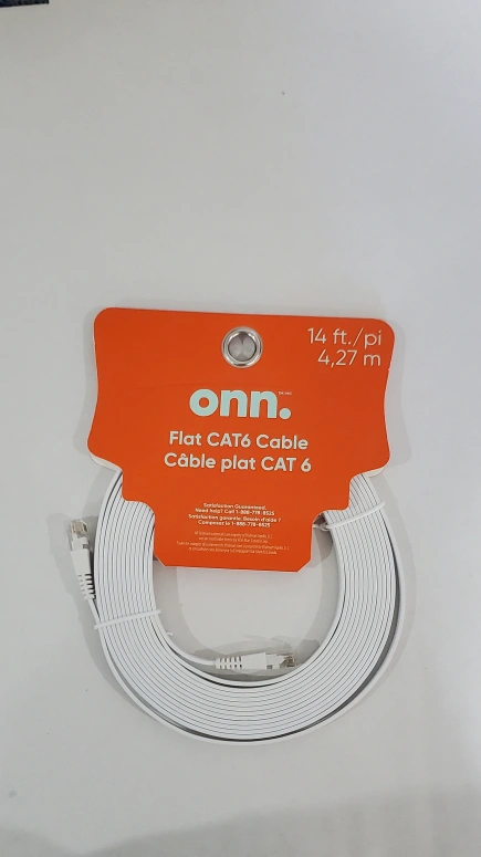Selling a brand new Onn. Flat CAT6 Cable in white. It's 14 feet long, or 4.27 meters. Perfect for connecting your devices!