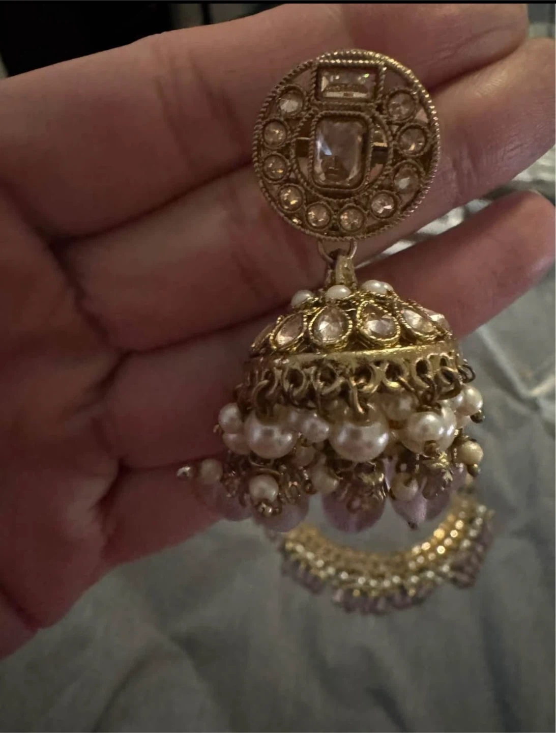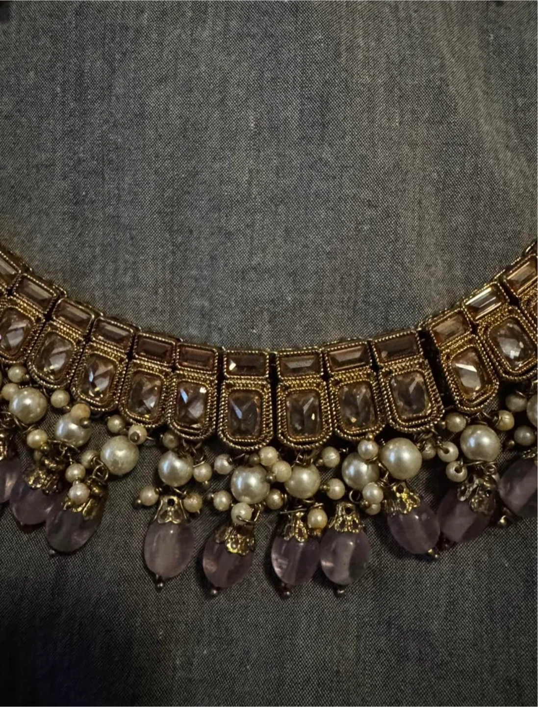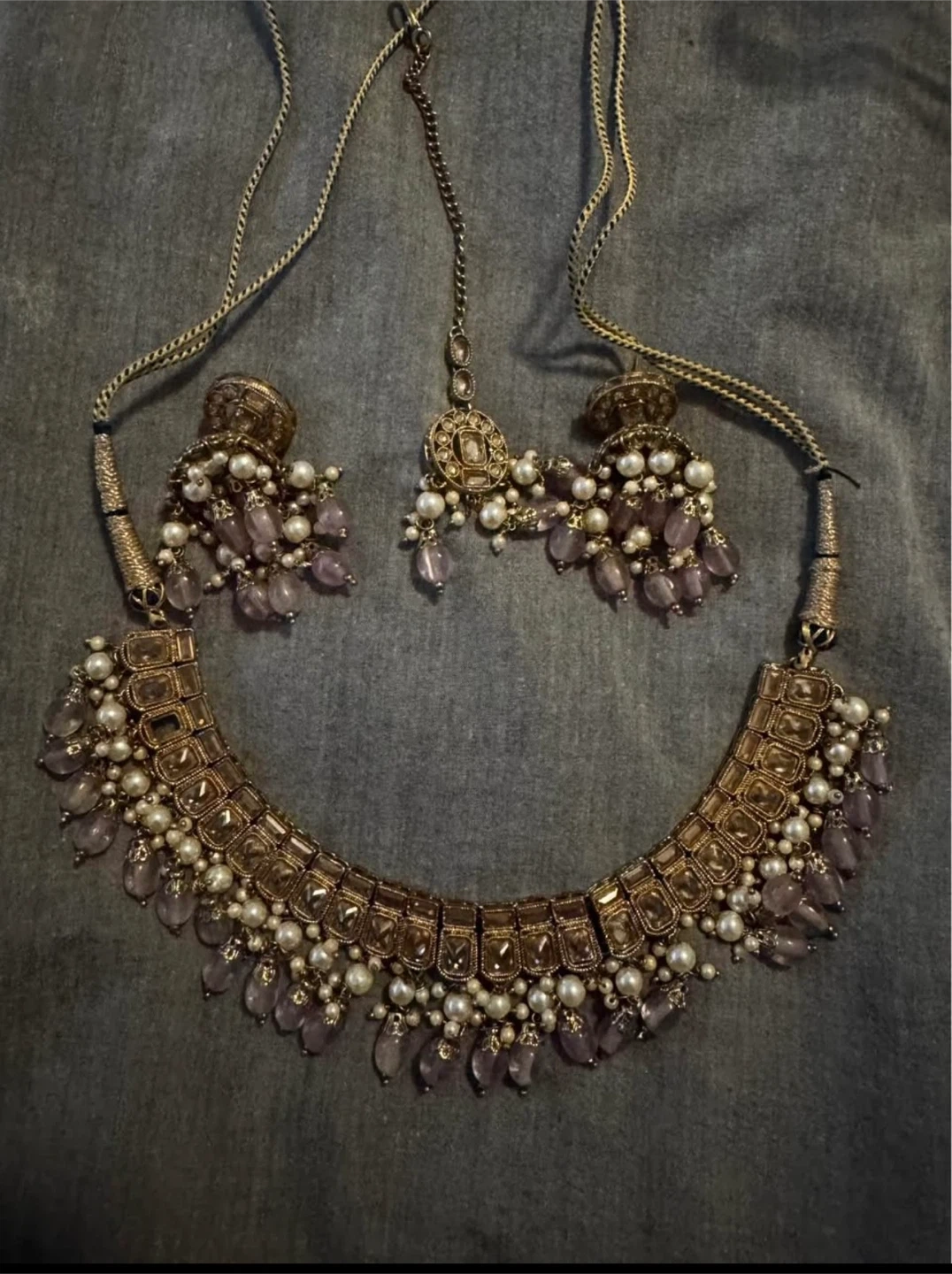 Beautiful necklace, earrings and tikka set. The set features gold-toned metal with pearl and lavender-coloured stone accents. Perfect for a special occasion!