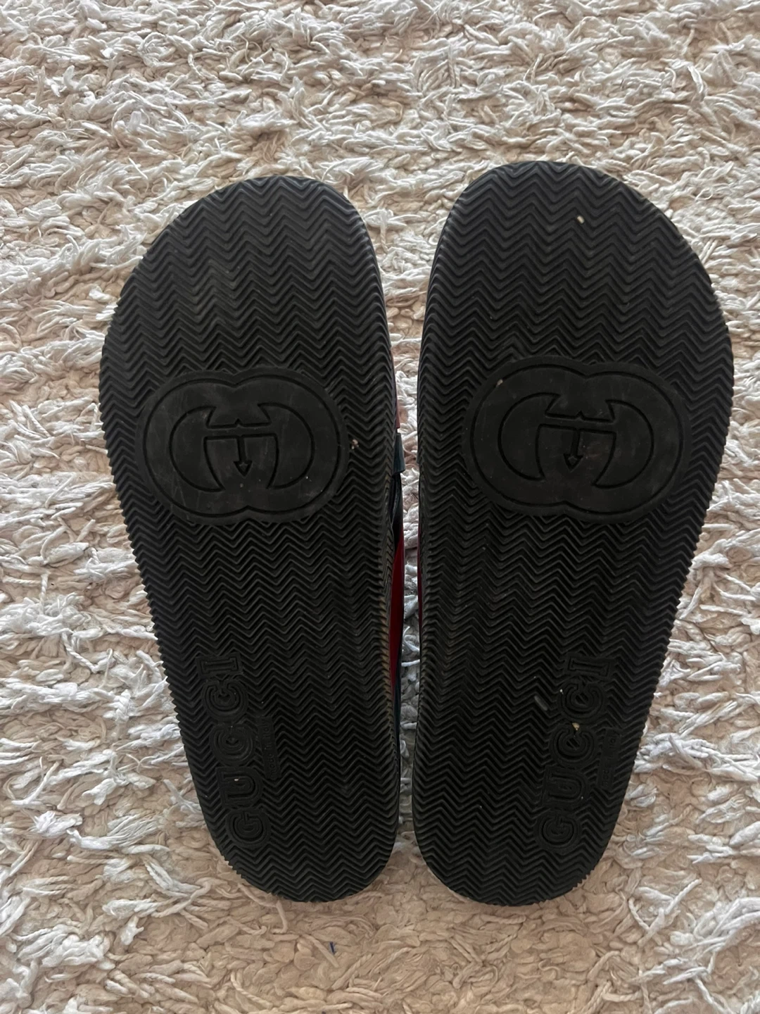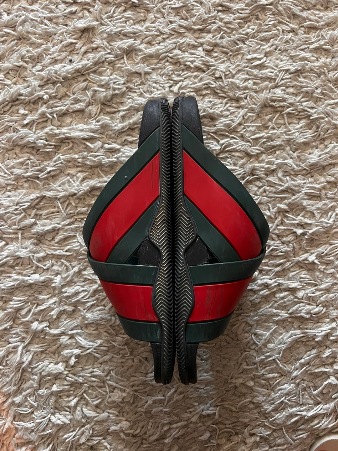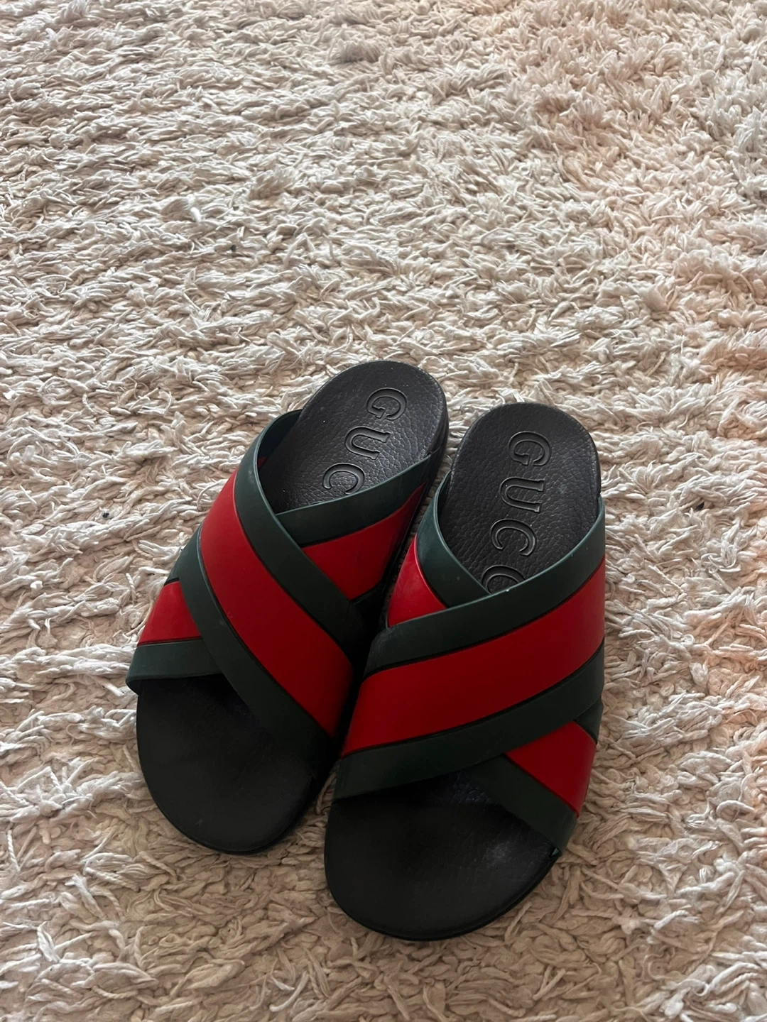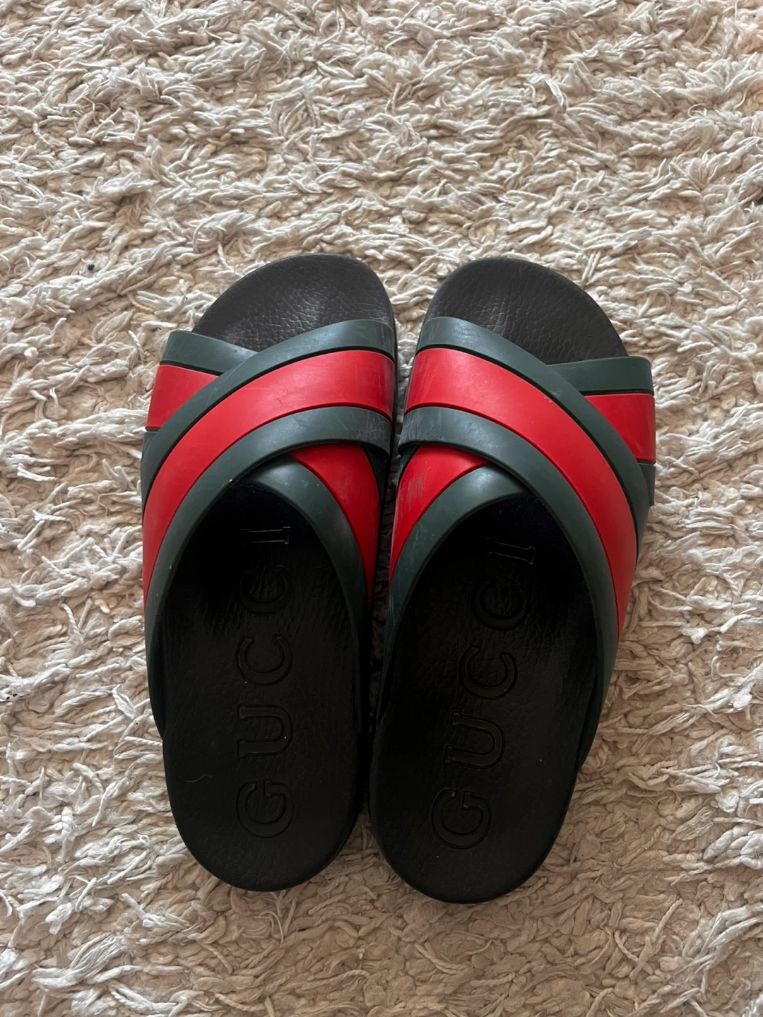 Selling a pair of authentic Men’s size 11 Gucci slides with a red and green stripe pattern. They're in good condition and feature the Gucci logo on the sole. Perfect for adding a touch of luxury to your casual wear! Comes with dust bags no box tho. Reference: https://www.reversible.com/ca/user/kickscrew/listings/gucci-gucci-rubber-slide-green-red-630326-j8700-8460-200032457?srsltid=AfmBOoo6iyPkTQuULw7owWHQP9Mdq04sBmJCTUYL8npWHbhnVVkbn47kCTw Cash only. Thank you!