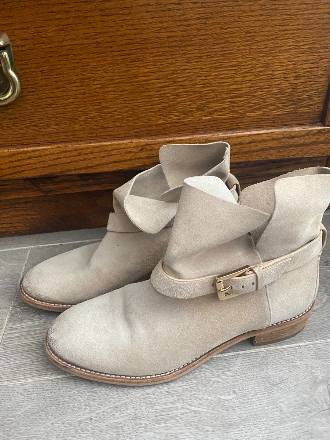 Selling a pair of Michael Kors beige suede ankle boots. They feature a stylish wrap-around design with a buckle accent. Perfect for adding a touch of chic to your wardrobe! Very good condition