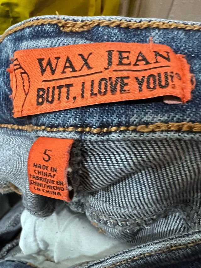 Check out these Wax Jeans size 5, a stylish addition to any wardrobe, offering a flattering fit. These jeans have a classic denim look that pairs well with any top. They are gently used and ready for a new home. Here are some measurements: - Size: 5 If the ad is up, they're still available, so grab them before they're gone! I'm pricing these at $20, a fair price for their condition.