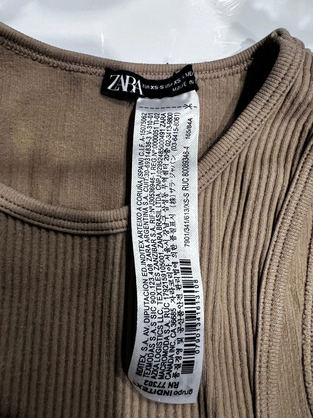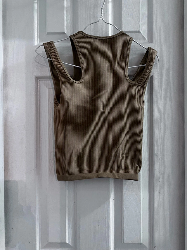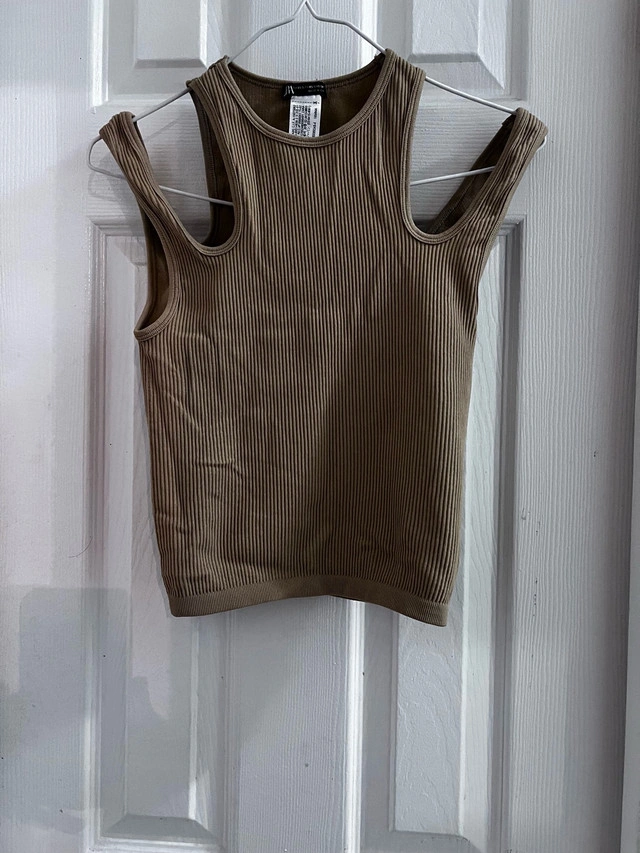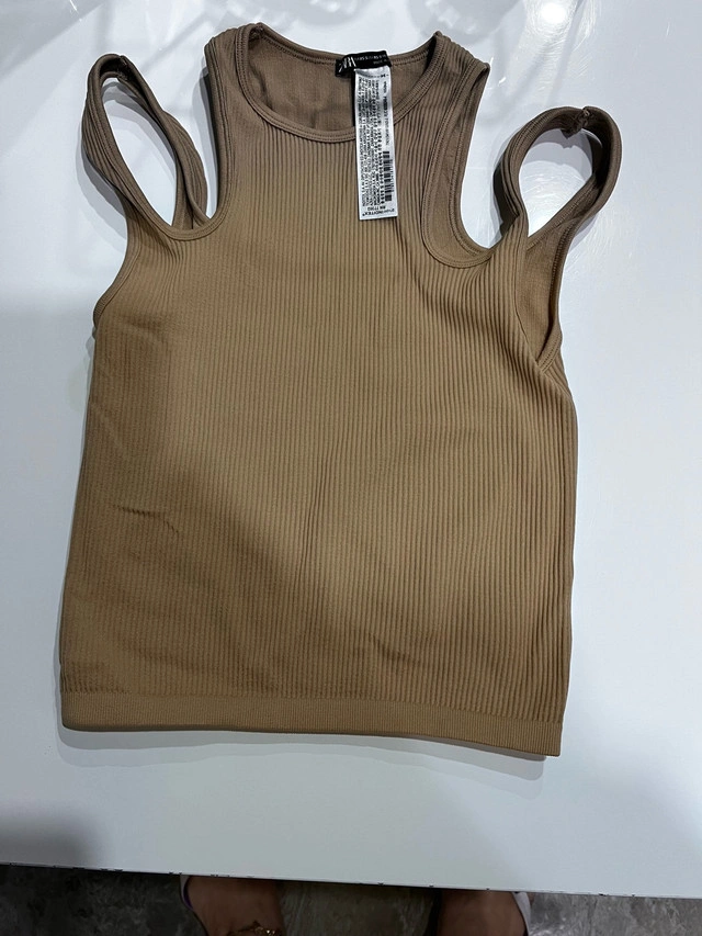 This Zara tank top is a stylish and comfortable addition to any wardrobe, featuring a unique cut-out design, a ribbed texture, and a flattering fit, perfect for casual outings or layering. As it is a gently used item, it presents great value while maintaining excellent condition. Additional details include: - Brand: Zara - Size: XS - Colour: Brown - Material: Ribbed knit - Design: Cut-out shoulder This tank top is looking for a new home! And a friendly reminder: if you're seeing this ad, the tank top is still available!