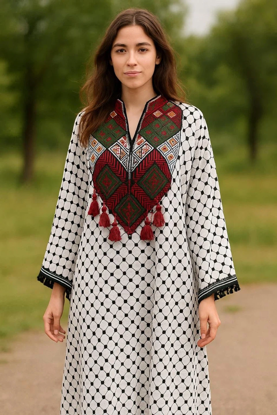 Beautiful Palestinian thobe dress featuring intricate embroidery and a classic keffiyeh pattern. This dress is perfect for cultural events or adding a unique touch to your wardrobe.