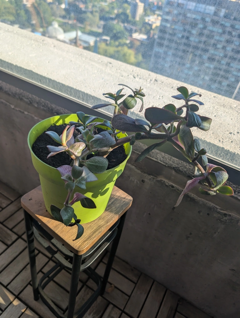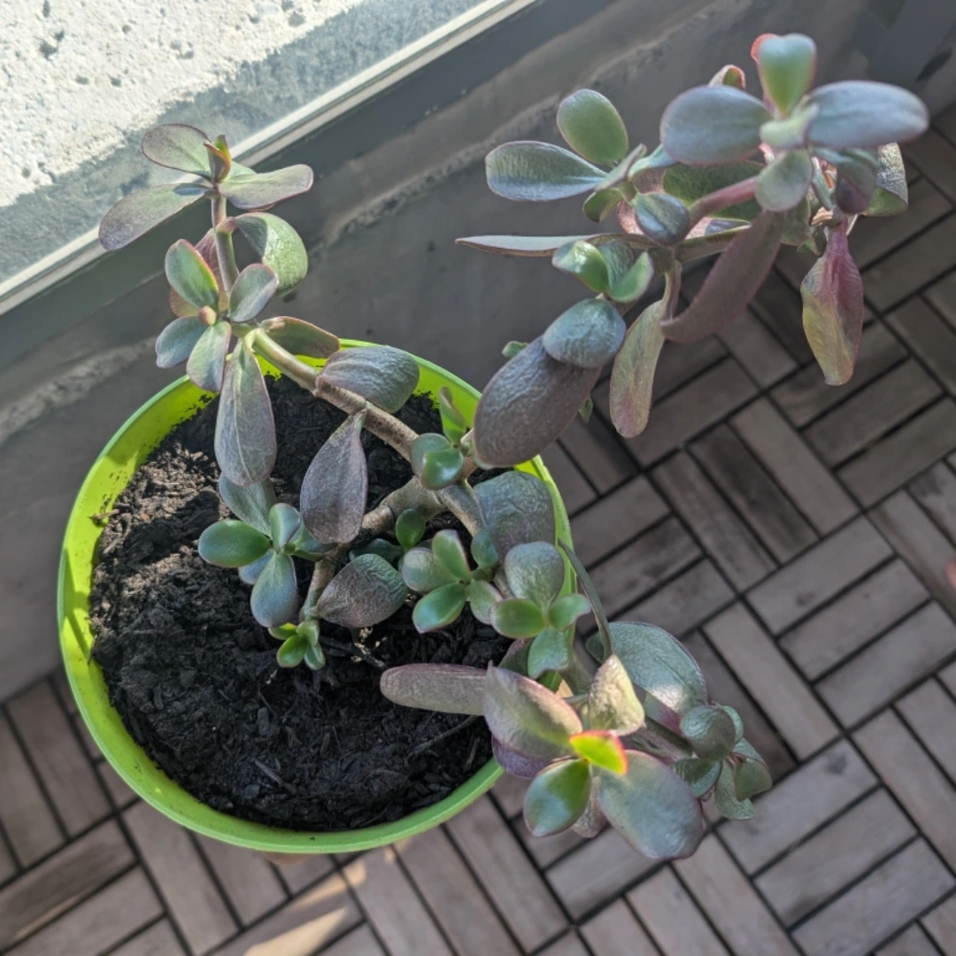 A healthy jade plant in a bright green pot, ready to bring some life to your space! Easy to care for.