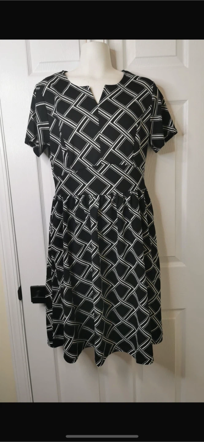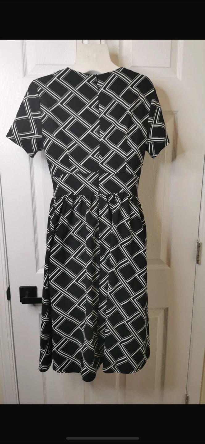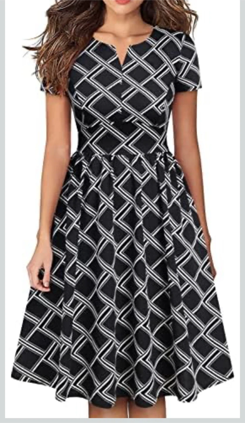New with tag! Selling a new YATHON dress in a striking black and white geometric pattern. It's available in size medium and large and features a flattering fit-and-flare silhouette. Perfect for adding a touch of style to your wardrobe! 💓 ELEGANT UNIQUE ROUND NECKLINE with a V-NOTCH : The women's a-line casual party dress has a plunging V shape, but good chest coverage and it doesn't show too much cleavage. Super cute! The neck line is unique and really flattering. The Invisible zipper in the back makes it easy to get in and out of, to protect your skin better. 💓 FLATTERING PLEAT On The SKIRT : This women's v neck church wear to work office dresses is very cute well cut and hugs your curves perfectly. The pleated skirts detailing on the garment adds a nice flair. Flare swing pleated skirt disguises hips and tummy, flowing very pretty and accentuates your figure.The overall look is just classy! 💓 VINTAGE AND CUTE DRESS UP : This is elegant women's swing casual work dress. Retro women's fit and flare cocktail a line dresses dressed it up with a hats, heels/wedges/flip flops/boots, jacket, nice earrings necklace, jewelry and it was great. Make you have elegant feminine look! 💓 FIT LIKE A GLOVE : The women's vintage v-neck party wedding guest church business work fit and flare dresses very flattering fit well— true to size. Length is knee-length. It is the perfect length to wear out. 💓 FOR ANY OCCASIONS : Classy women's retro cocktail fit and flare casual dress that could be dressed up or down depending on the occasion. Such as wear to work, business casual, office, a job Interview, partys, church, beach wedding, wedding guest, honeymoon, holiday, trip, cruise, vacation, homecoming, birthdays, dinner, banquet, prom, cocktail, summer evenings, choir performance, play, dressy events, going out, date night, family, daily life, semi-formal or special occasions.