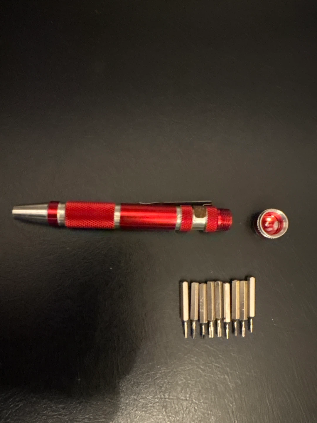 Selling a precision screwdriver set with a red handle. It comes with multiple bits, perfect for small electronics and other delicate tasks. The set is in good condition and ready for a new home! There is a small rust stain on top. Pick up only. Thank you.